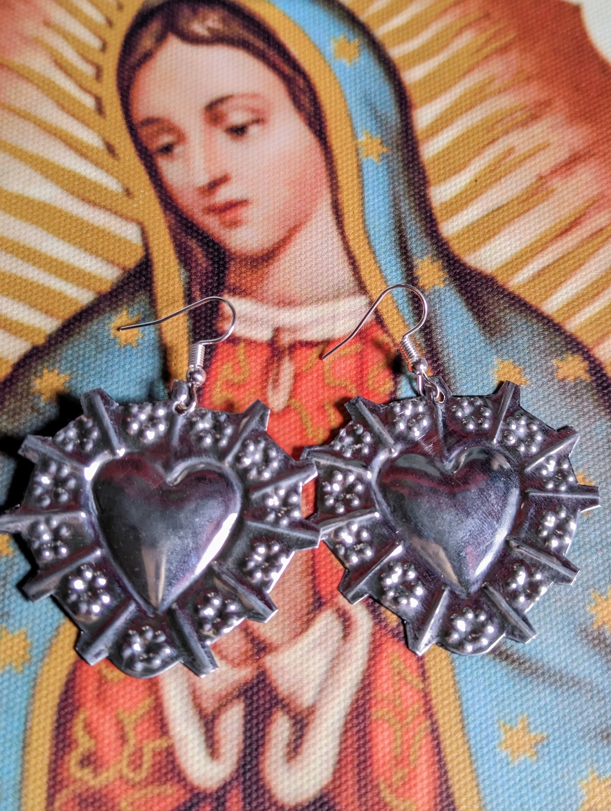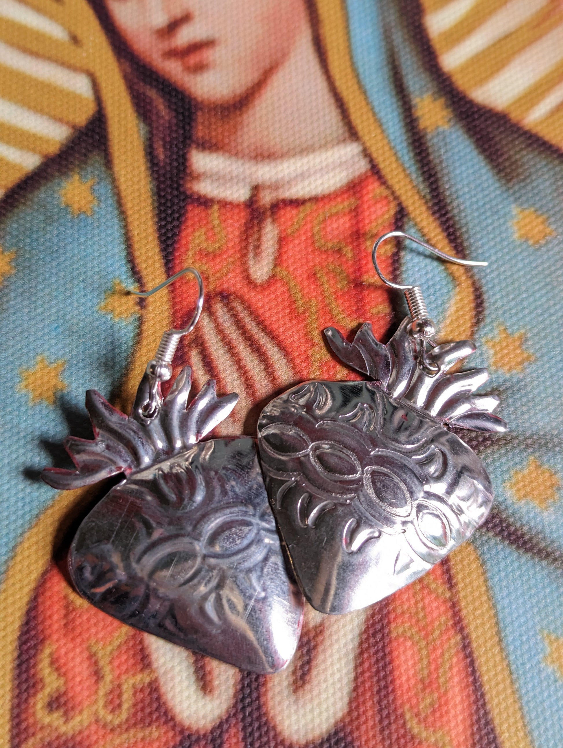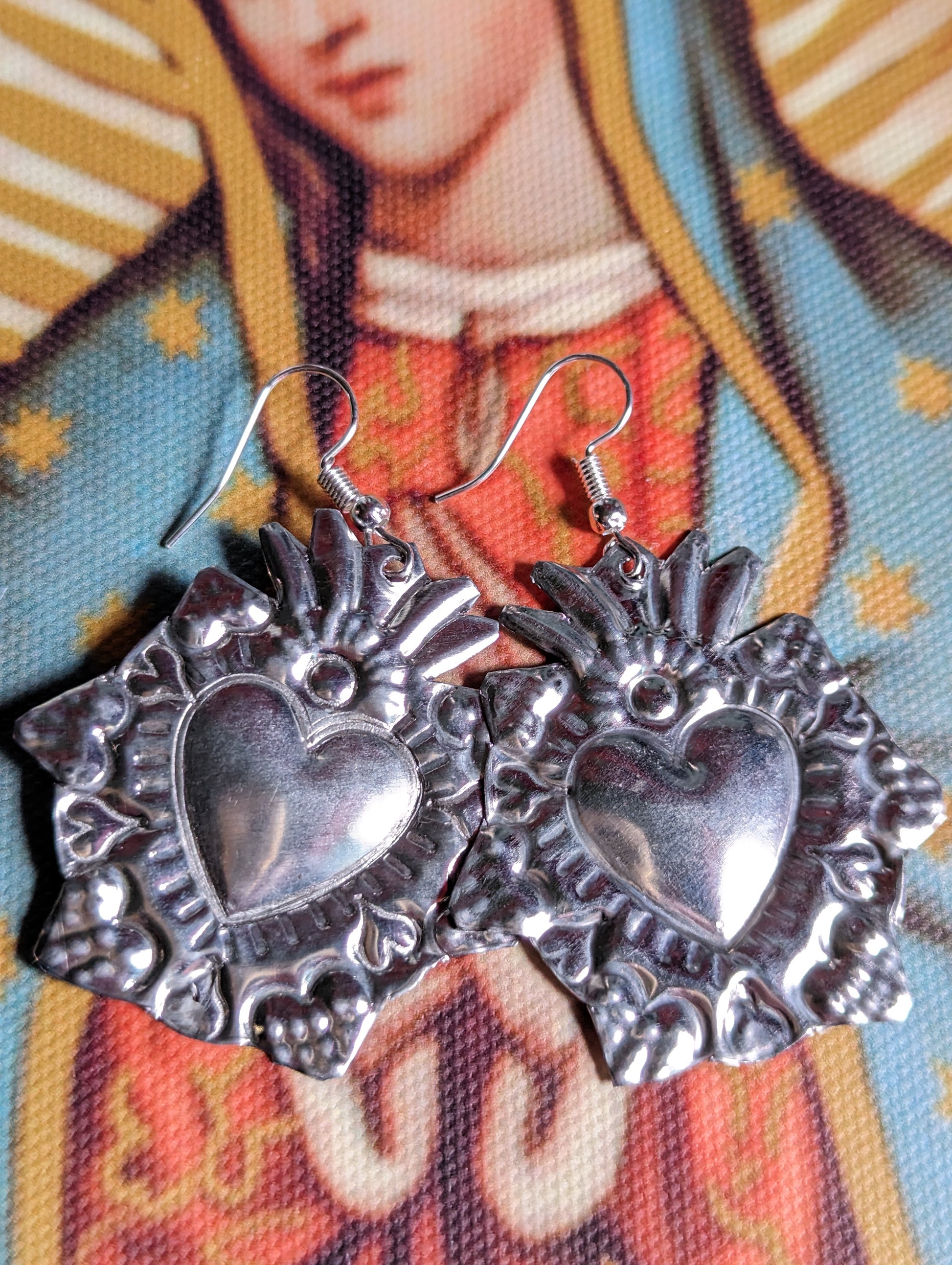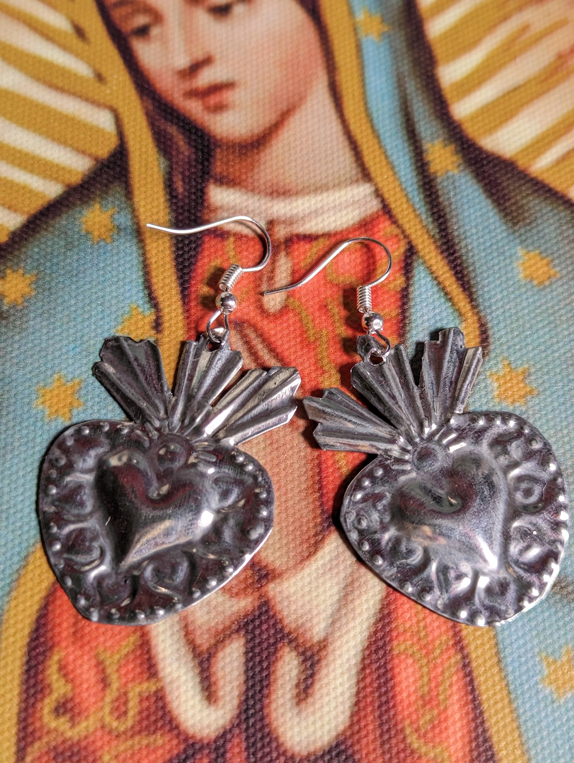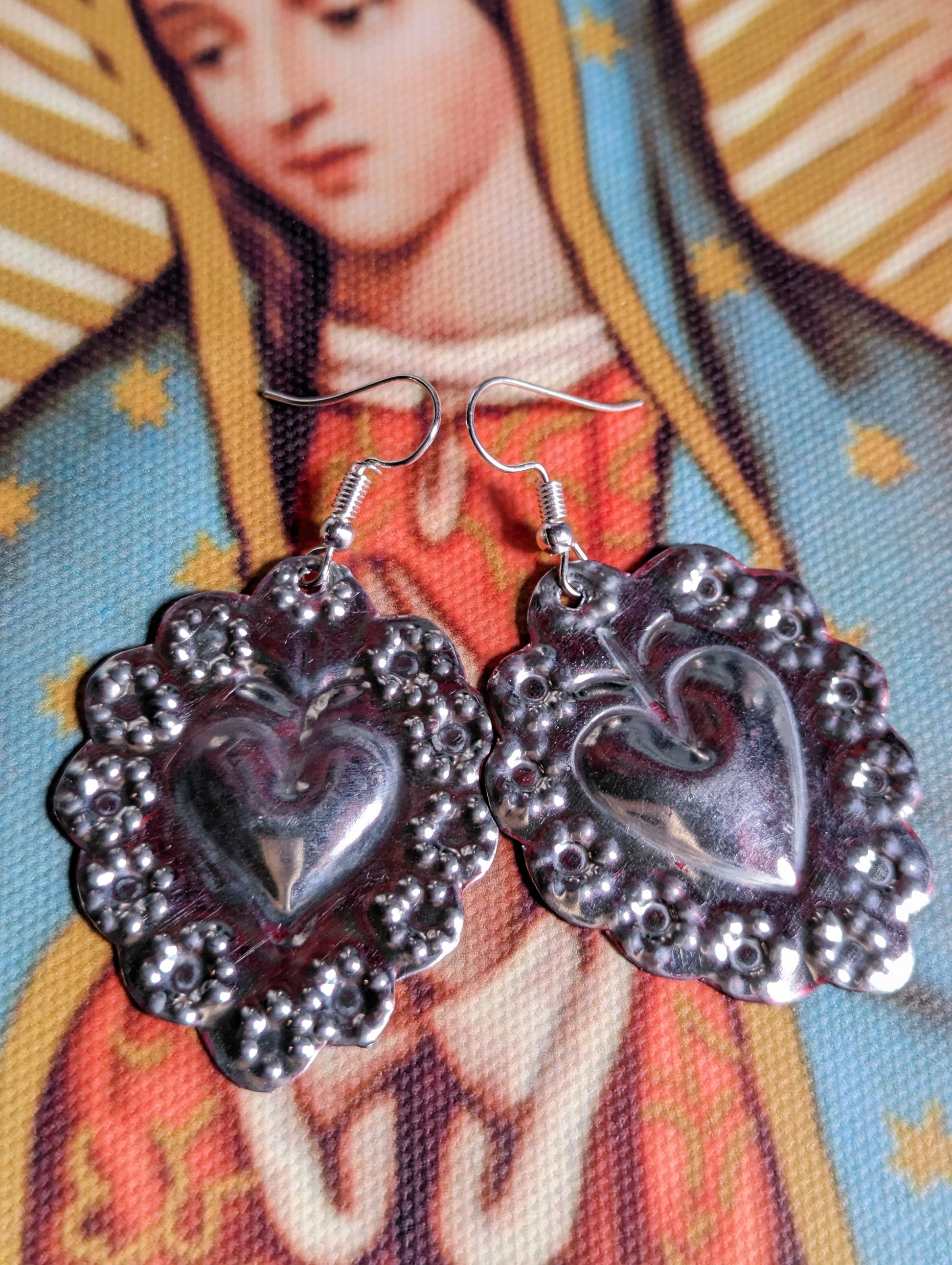 Handmade, lightweight milagros tin earrings handmade made in Oaxaca, Mexico. Hooks are silver plated.