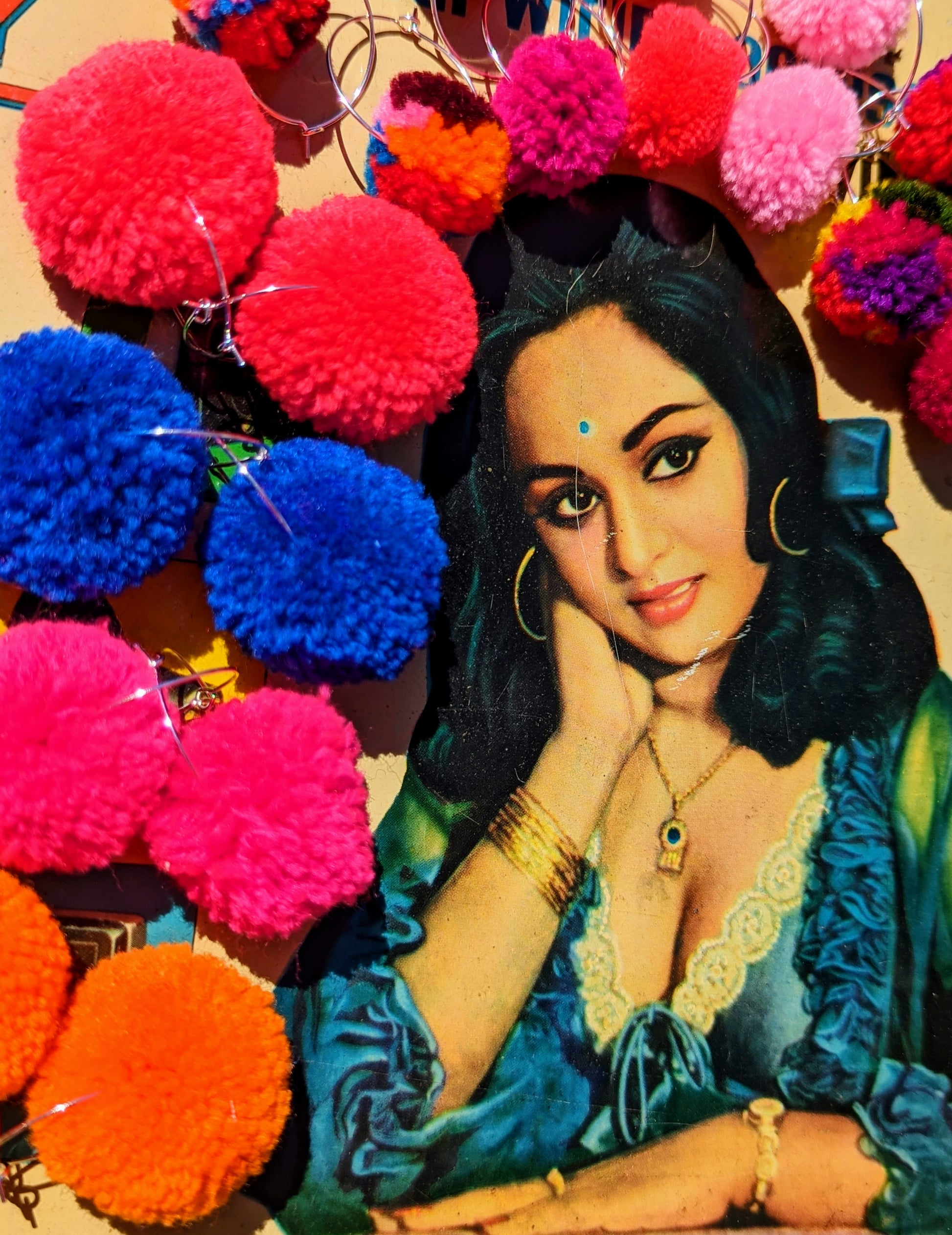 Handmade pom poms made in Thailand by minority tribal ladies for adorning their clothing, here we have threaded them onto silver plated hoops for a touch of tactile colour!!