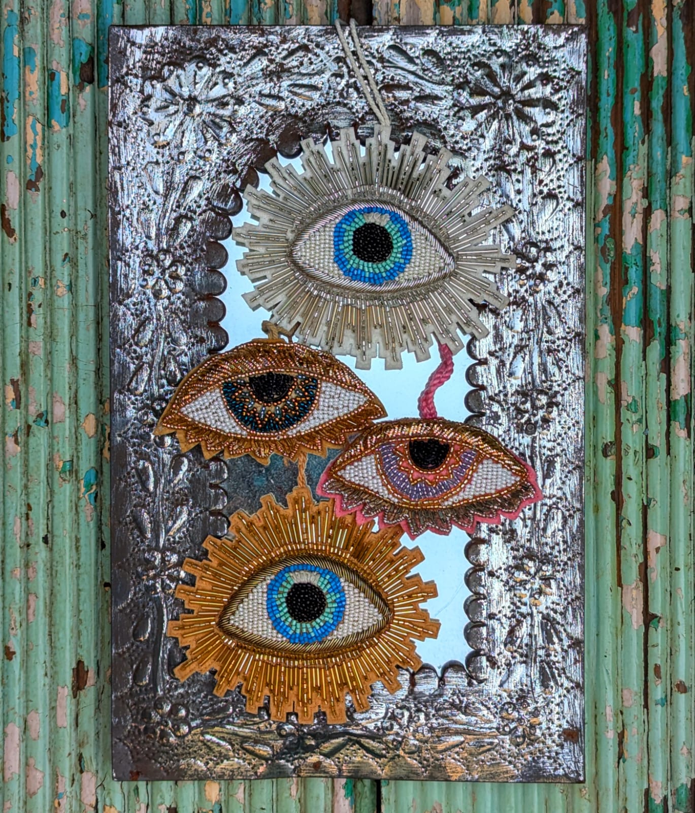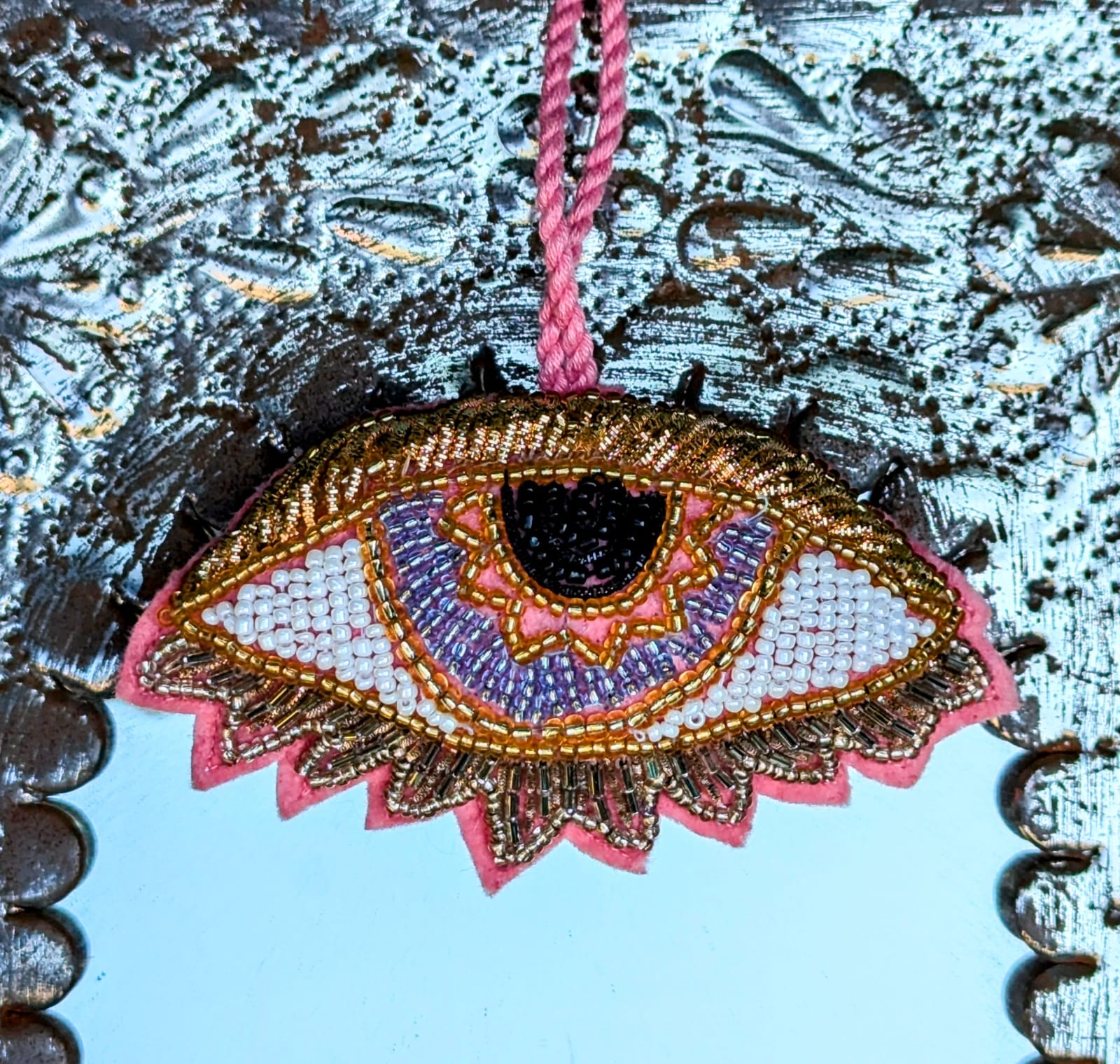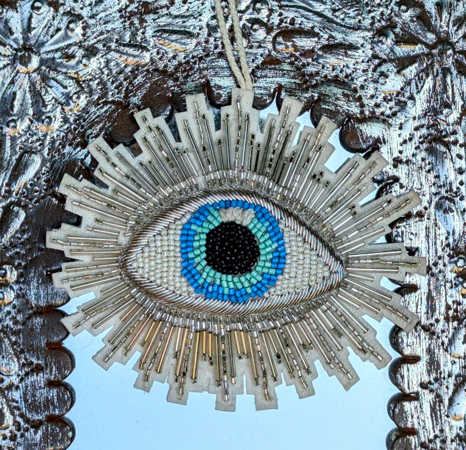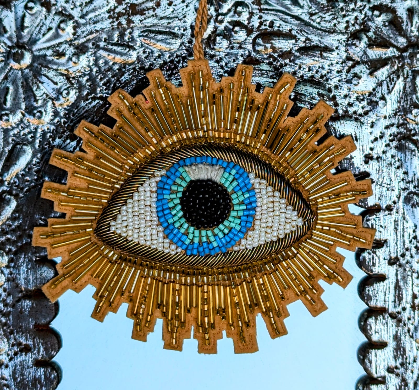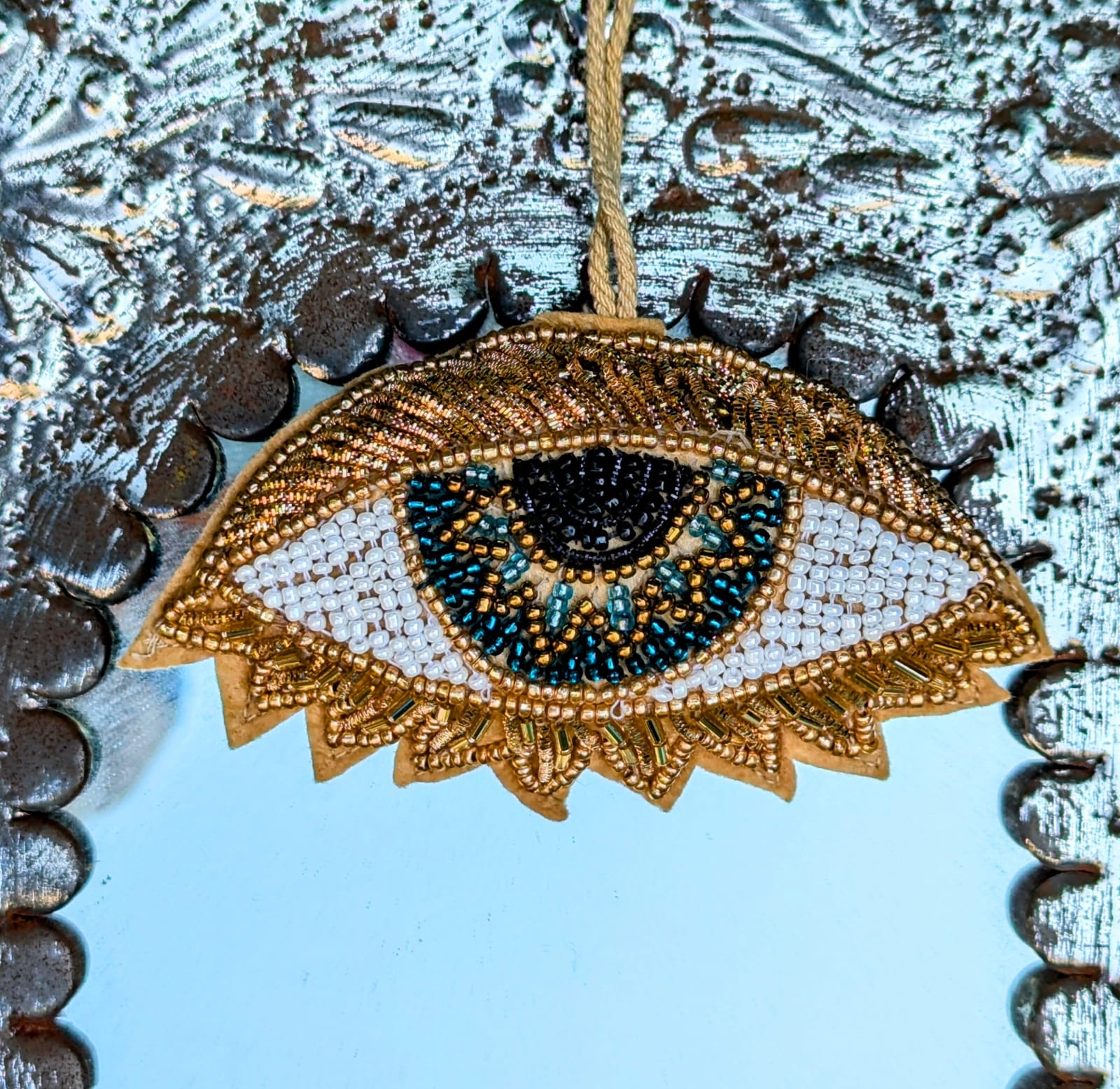 Gorgeous protective all seeing eyes hanging decoration with hand embroidered metallic wirework, and beautiful beads and sequins, sumptuous beauty!!