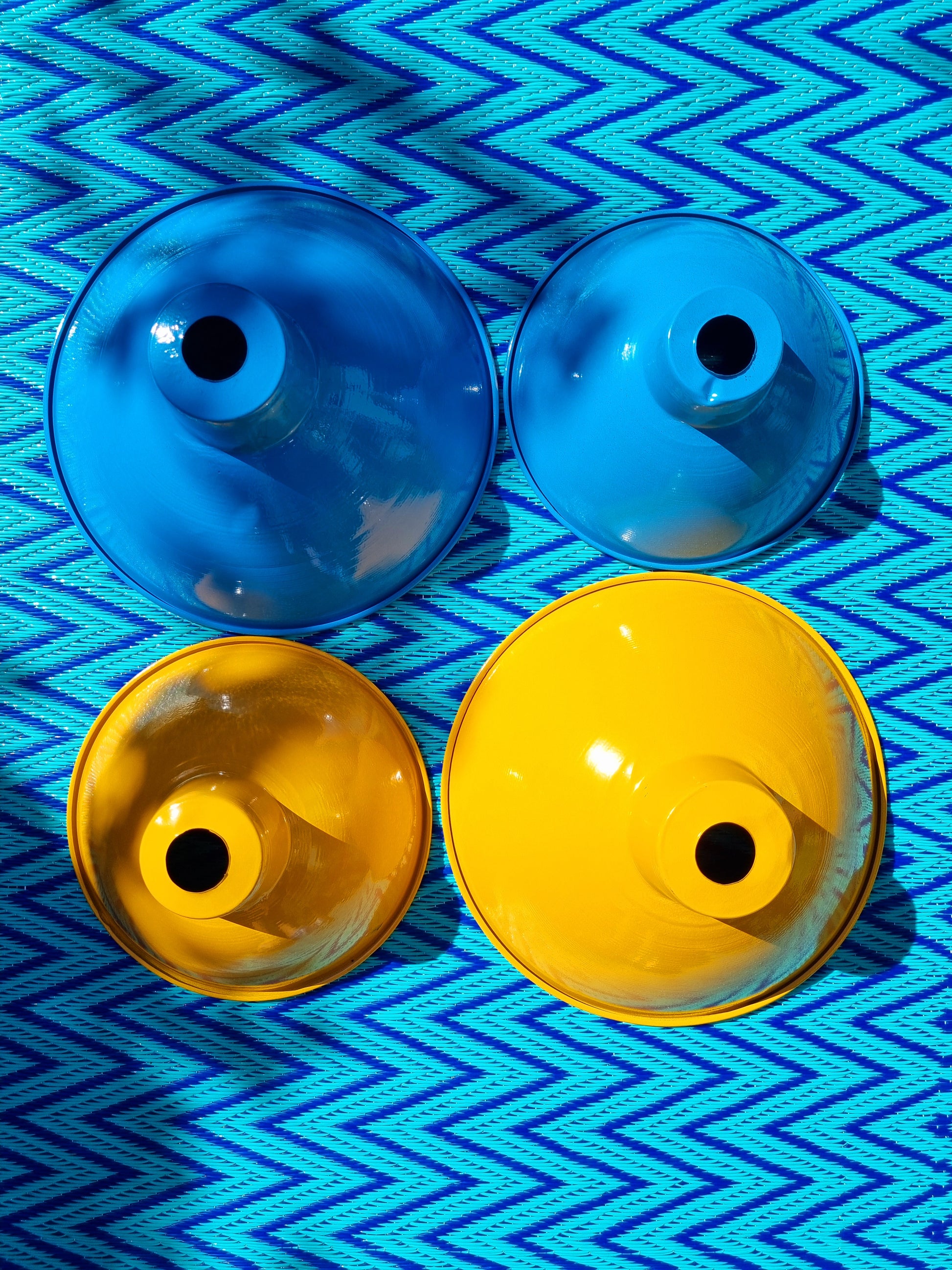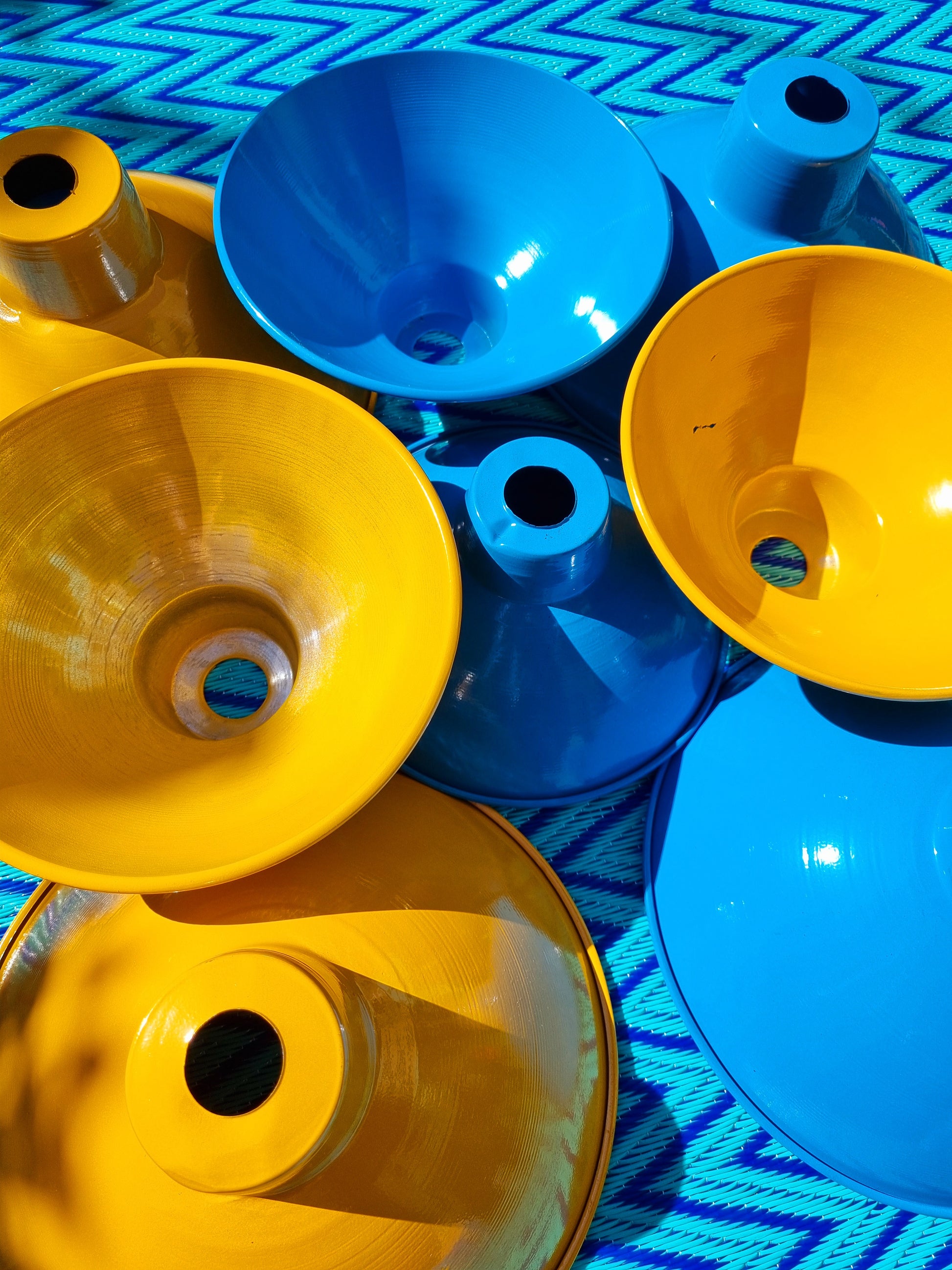 Recycled in India from aluminium cans these lampshade are light and lovely in these bold colours.