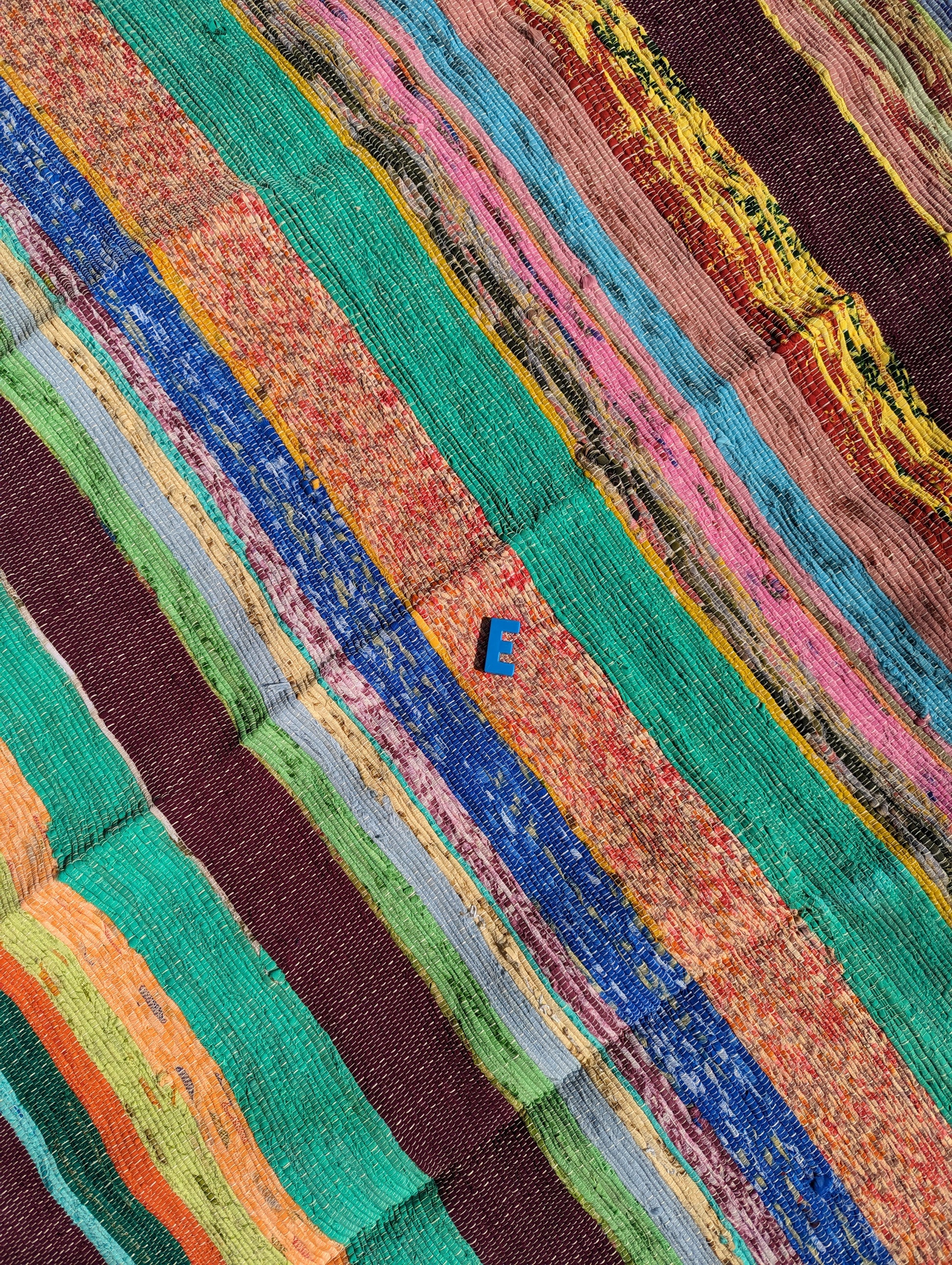 Due to their reuse and recycle nature, we cannot be absolutely sure about all fabrics included in each piece, so we advise either salt fixing in the washing machine before putting onto a carpet to avoid transfer of colour or using a matting between surfaces.