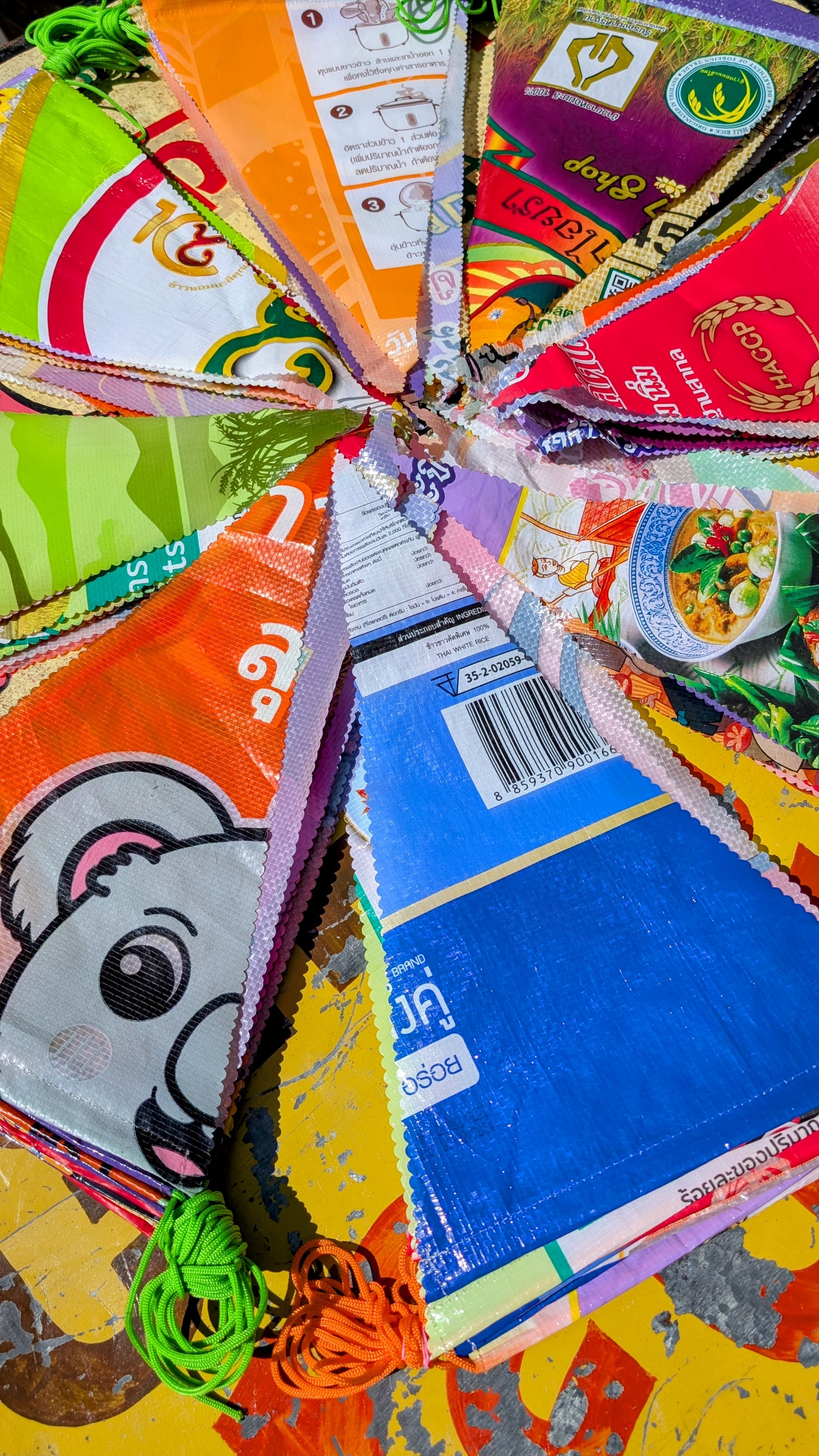 Flags are 32cm long and 20cm wide. Rice sack designs vary throughout.