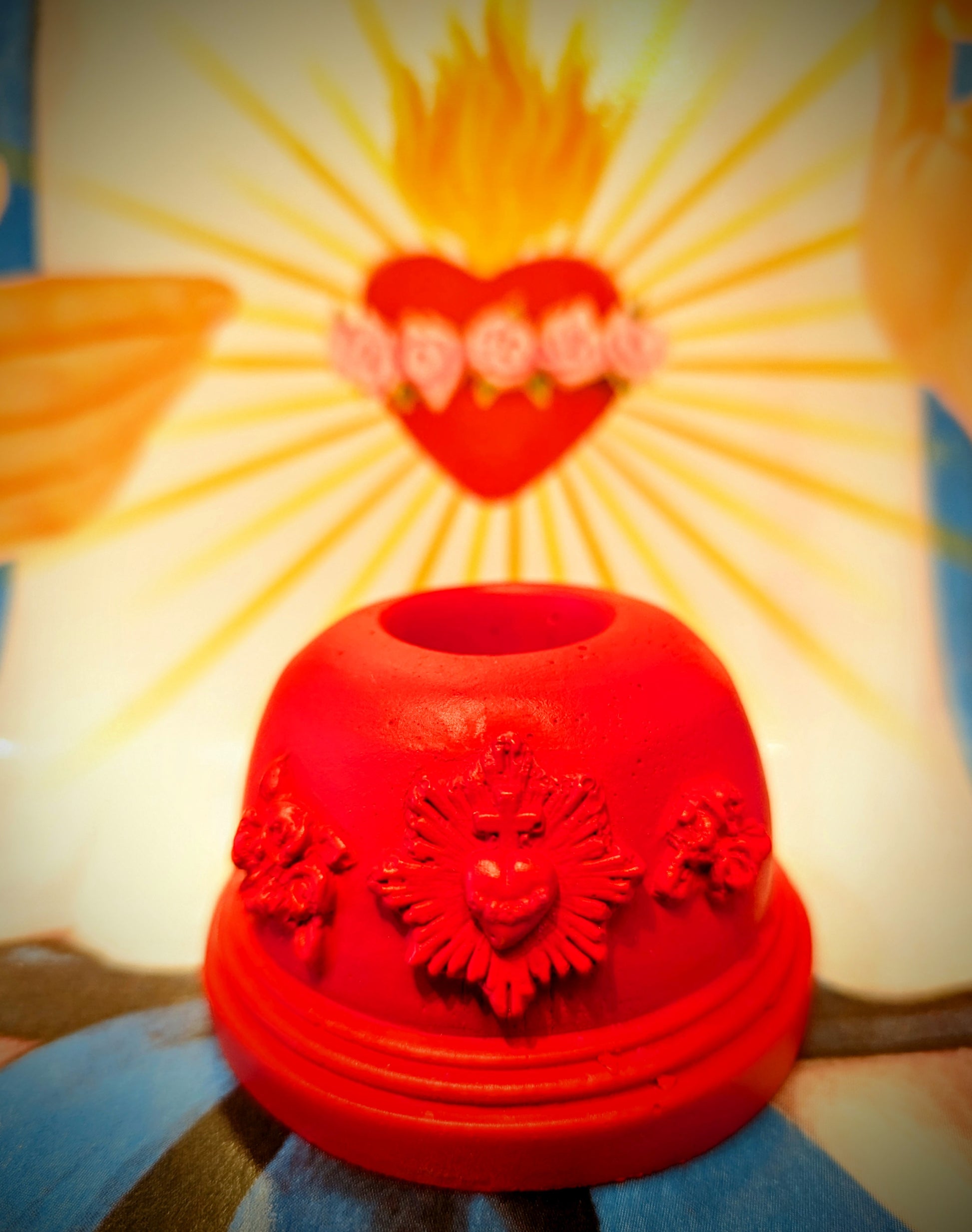 Beautiful hand poured plaster candle holders featuring the Sacred heart of the Virgin, and painted in the BEST colours!