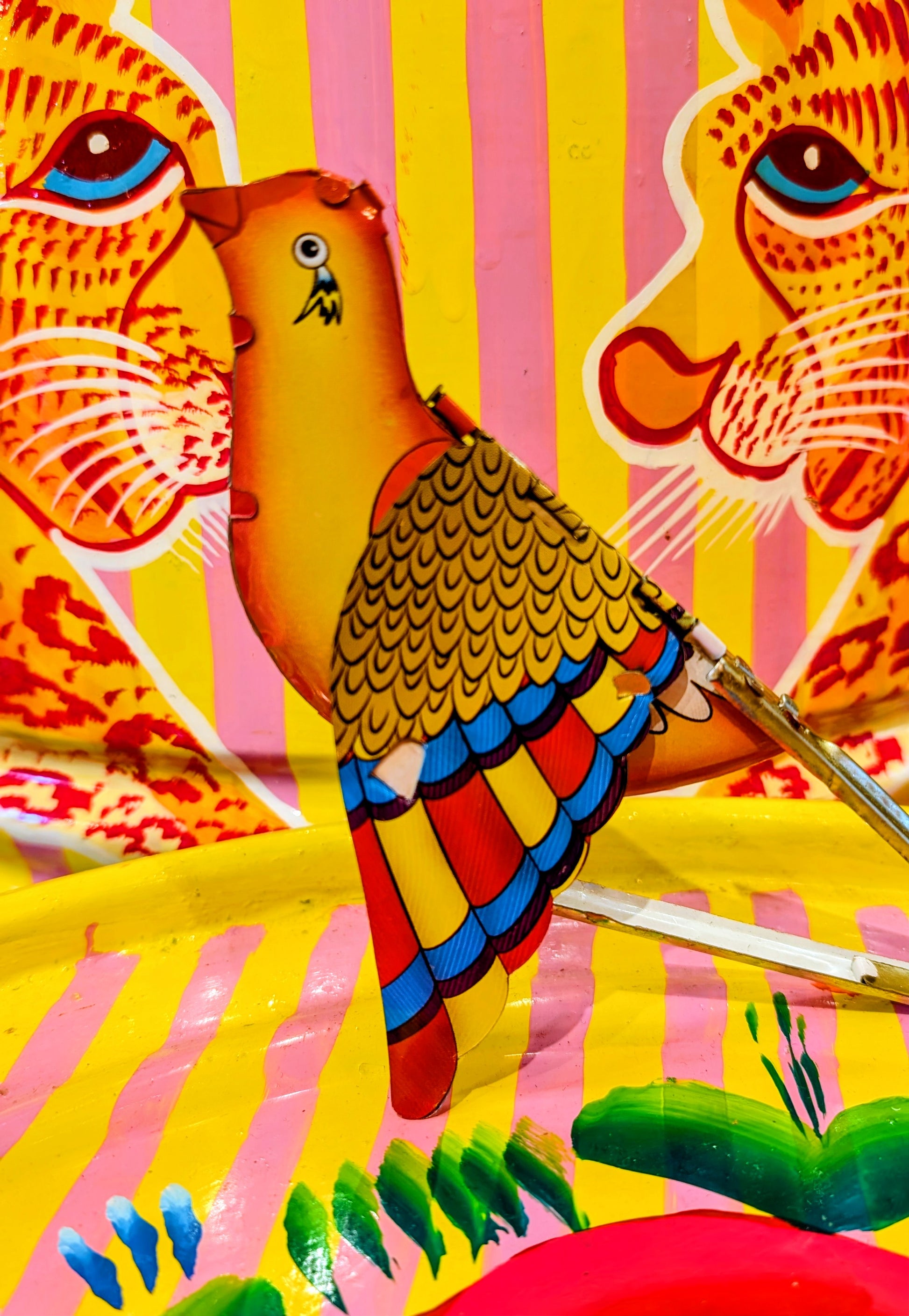 Beautifully printed, these are lovely singing birds have fabulous waxed paper bellows under each wing. When you squeeze the tail they chirp! Remakes of 1930s Indian tin toys.