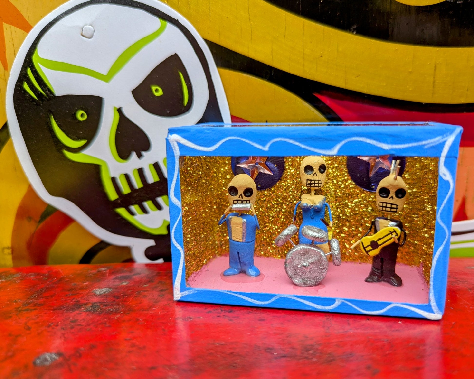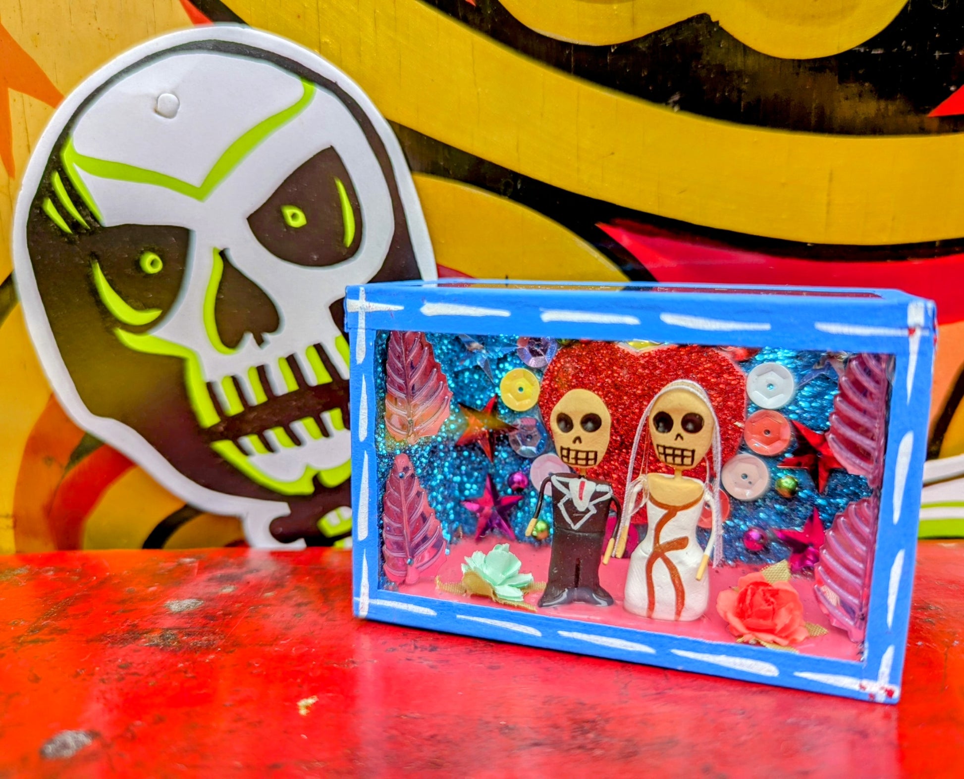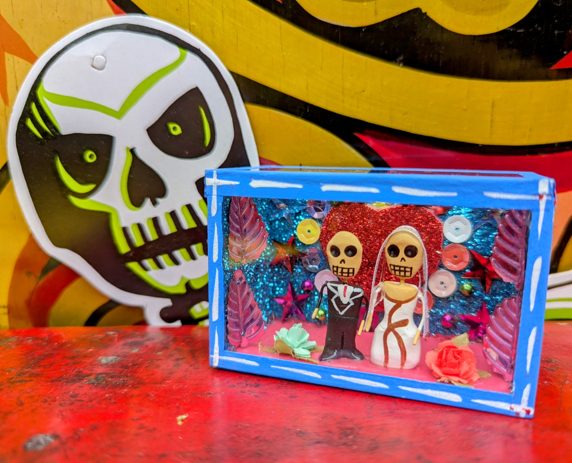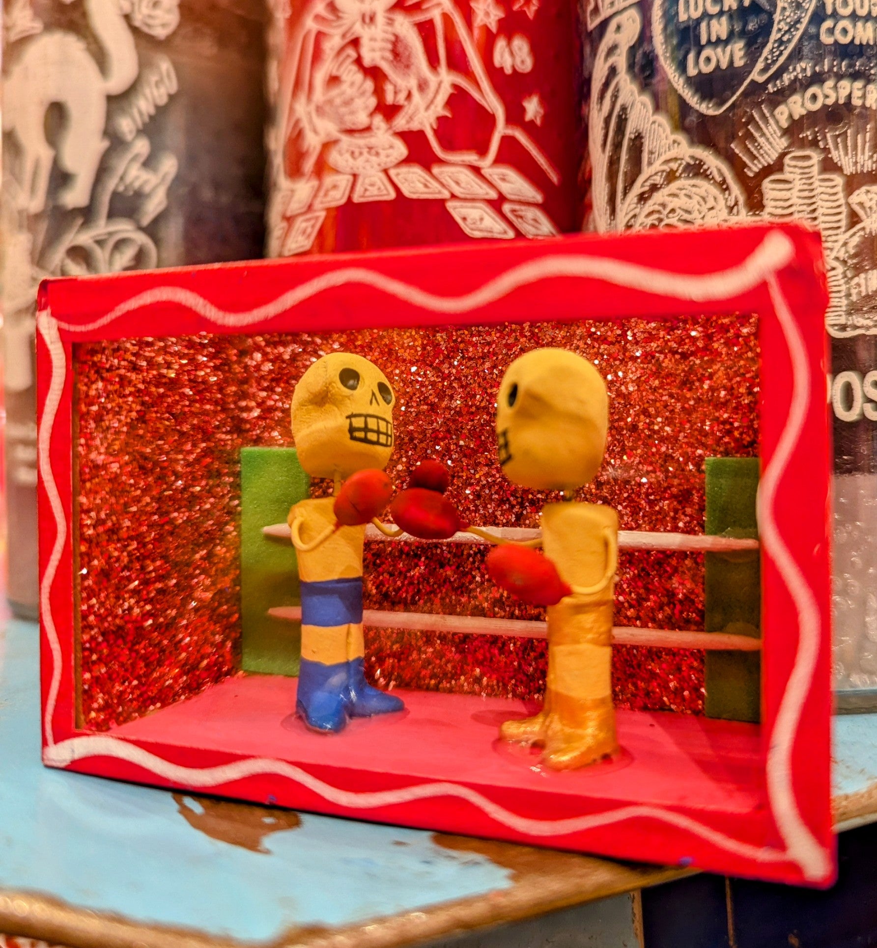 Each nichos is made by hand and unique. The themes are consistent however the colours of glitter and sequins and outfits will vary! All part of the charm!