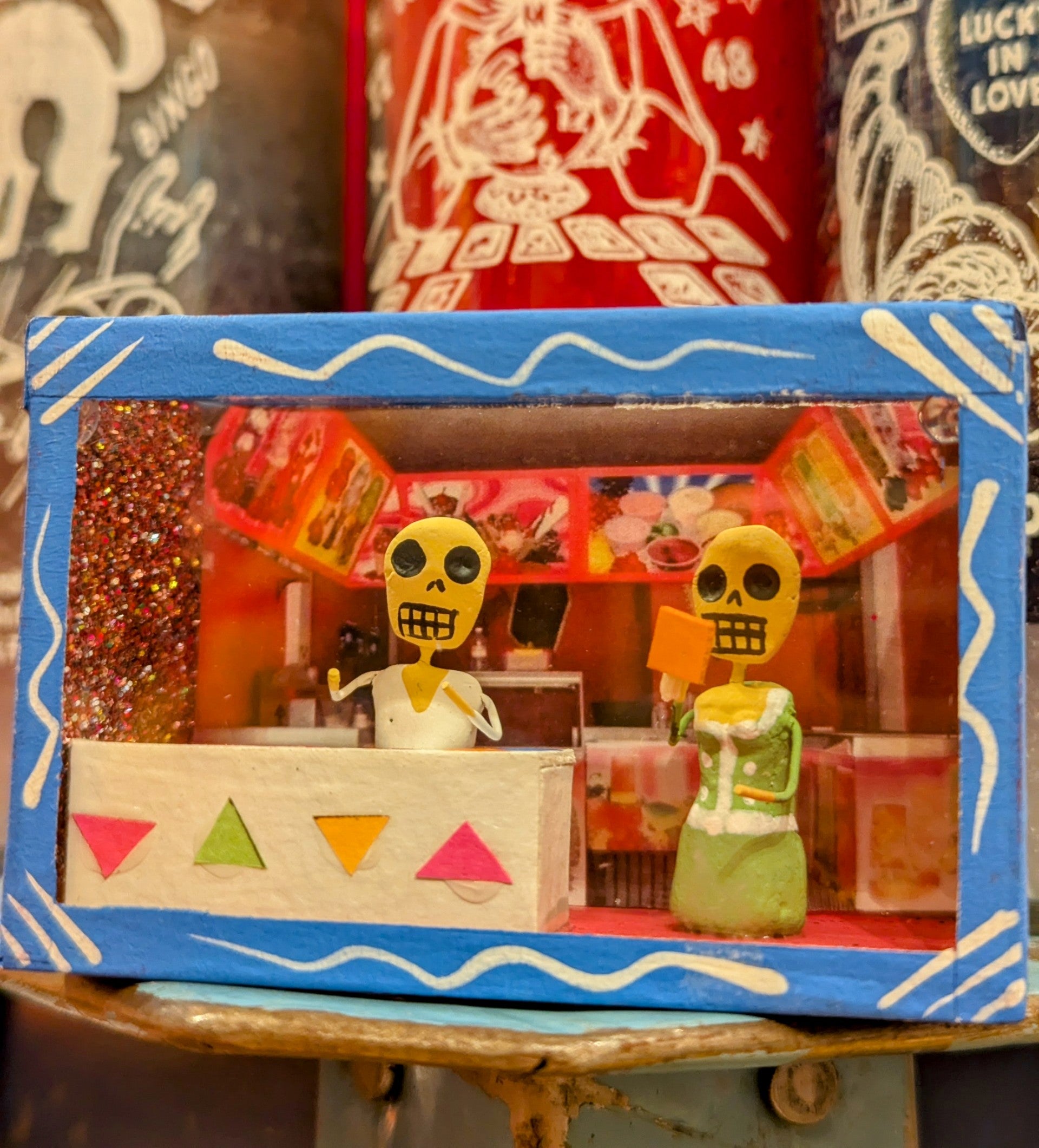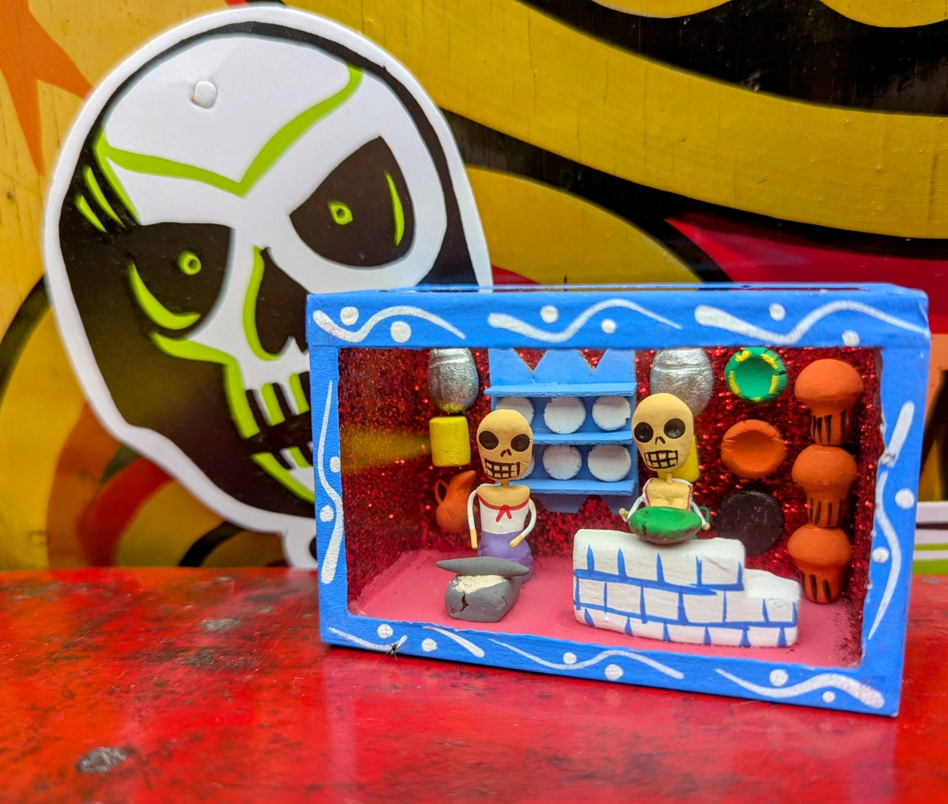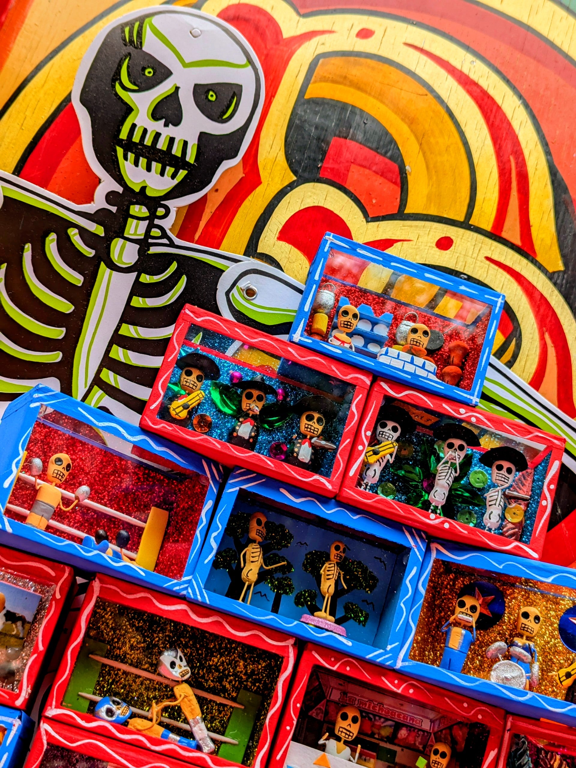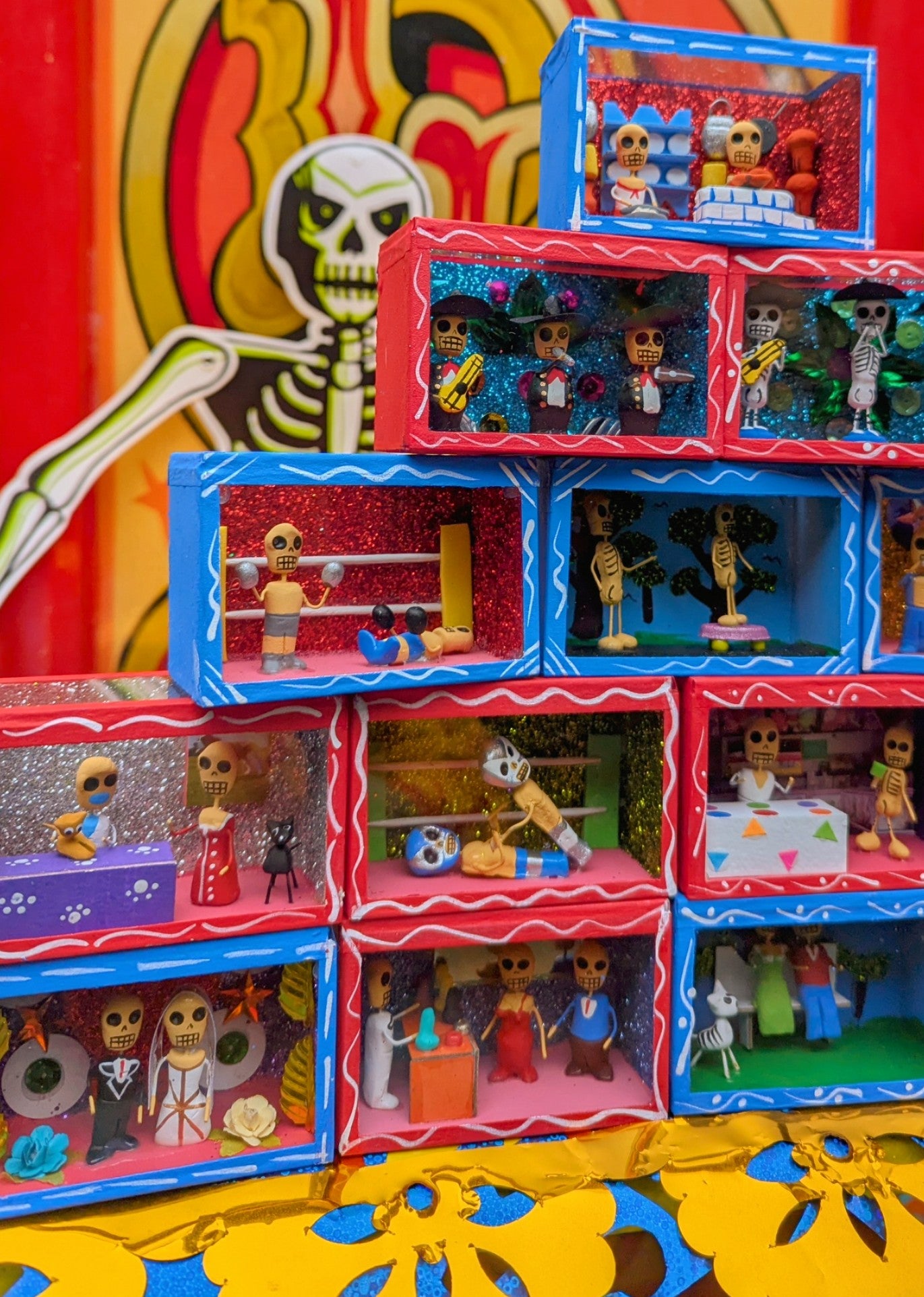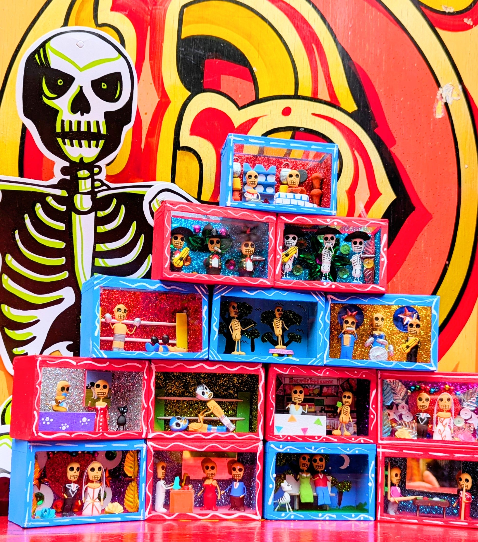 Originating in the Roman Catholic tradition of creating portable shrines known as Retablos, these Dia de los muertos Nichos depict scenes of vocations with handmade skeleton figures.