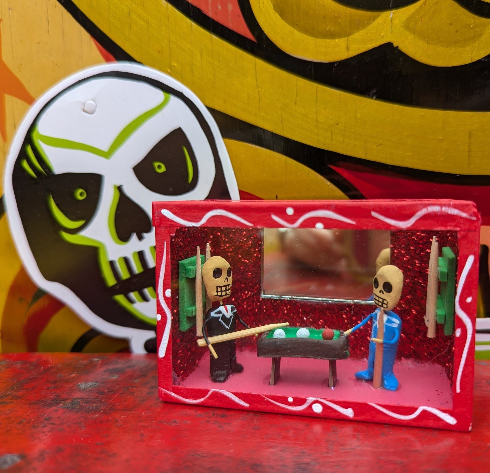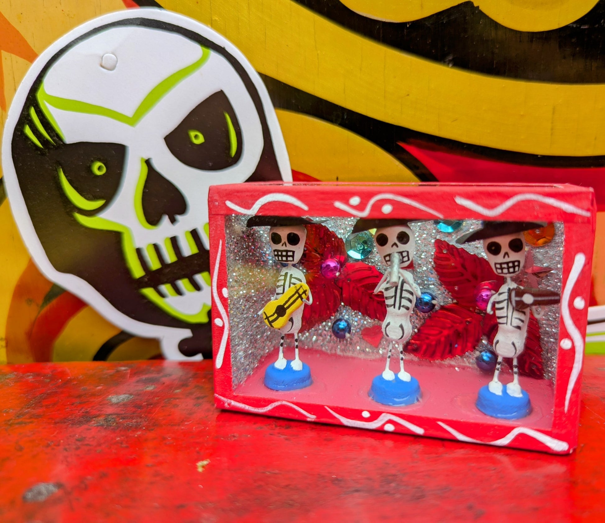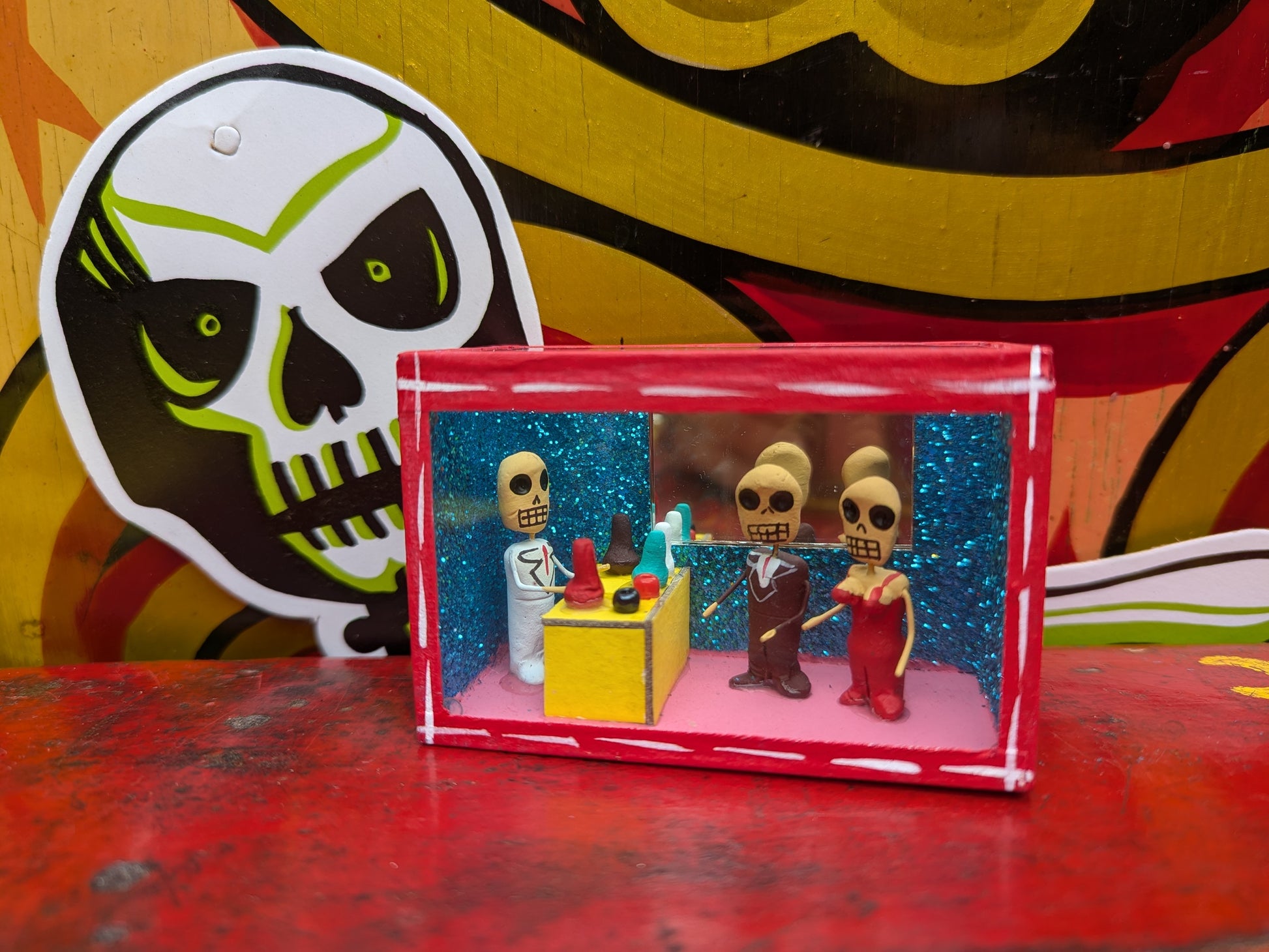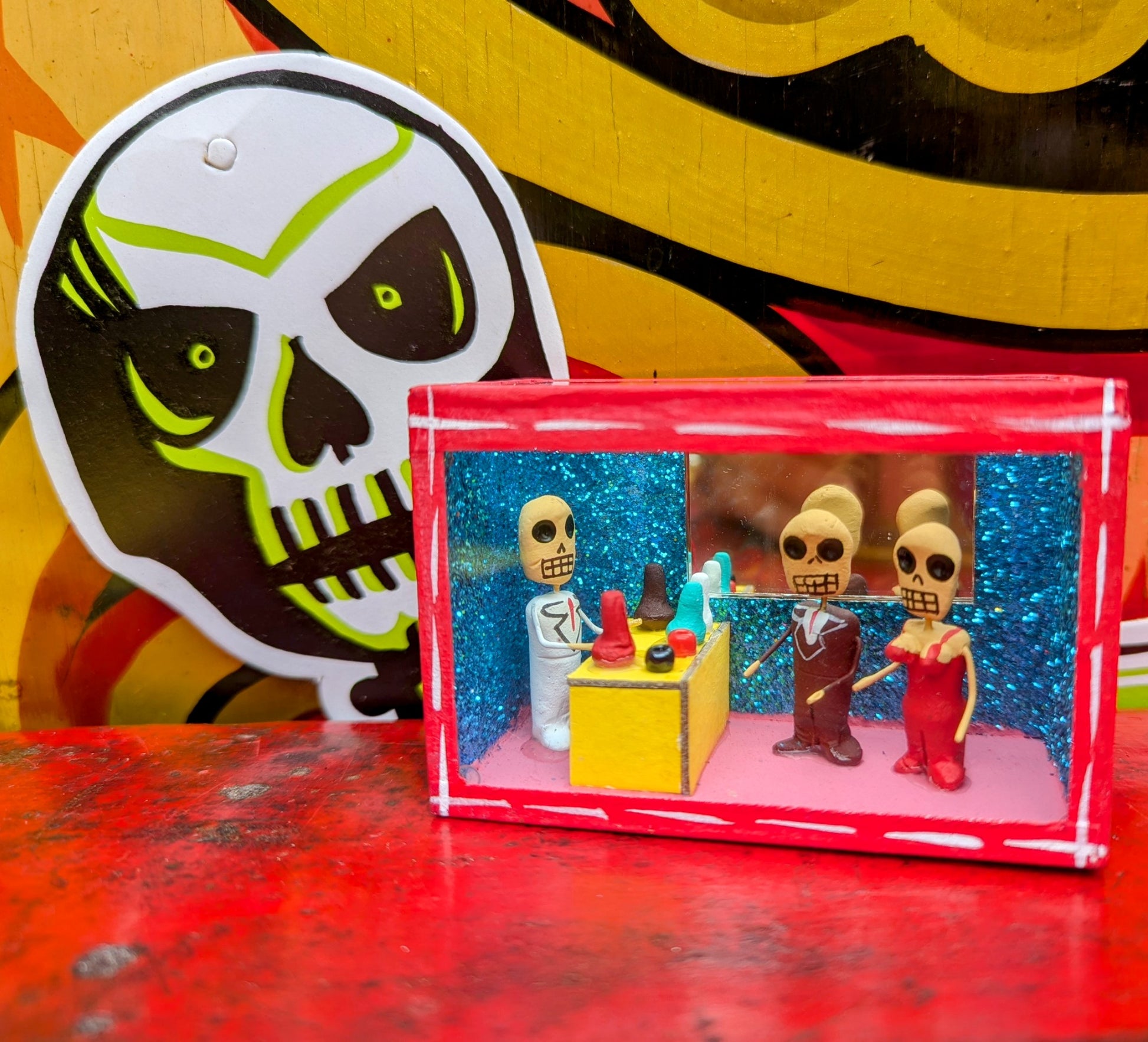 Originating in the Roman Catholic tradition of creating portable shrines known as Retablos, these Dia de los muertos Nichos depict scenes of vocations with handmade skeleton figures.