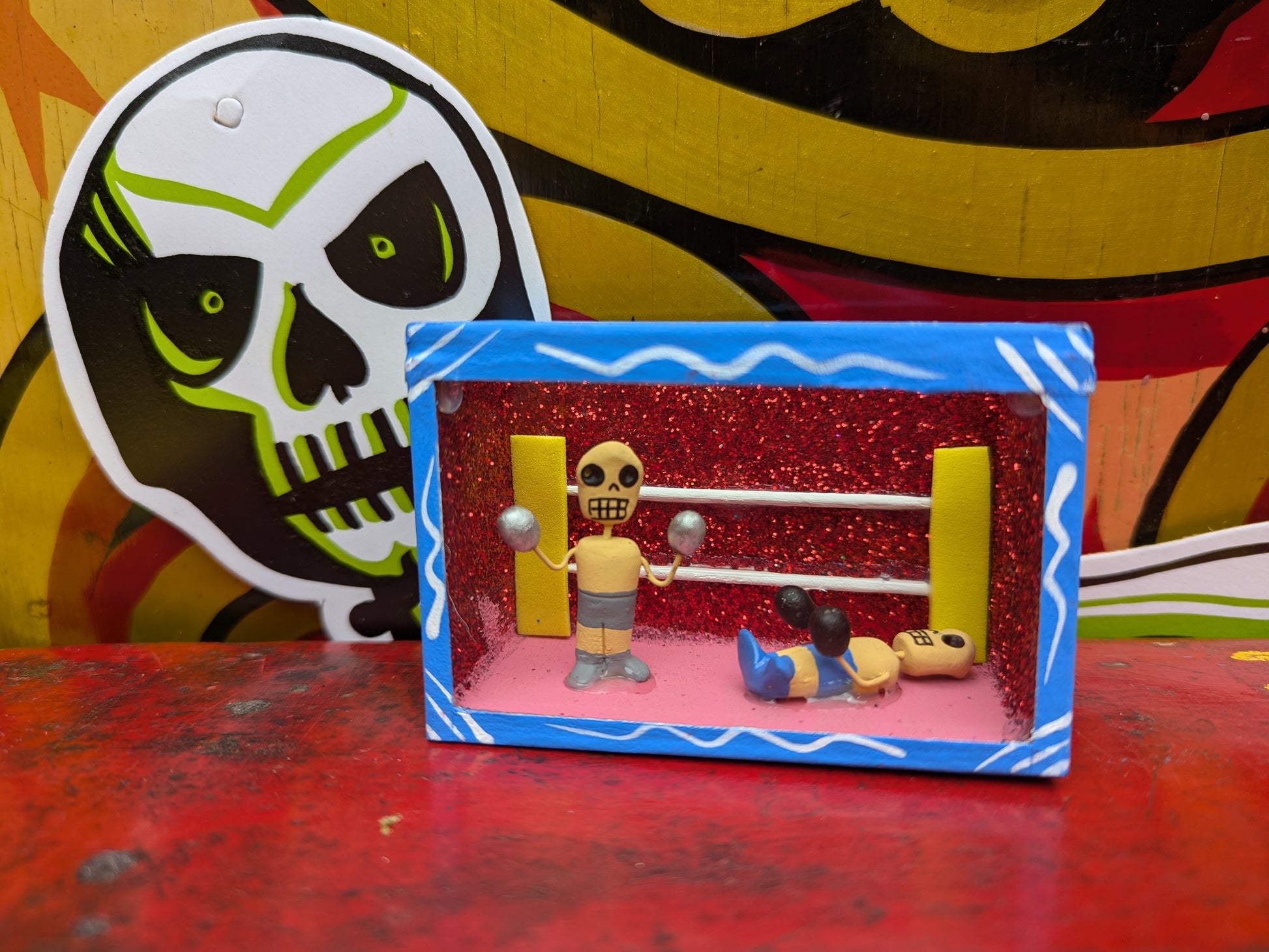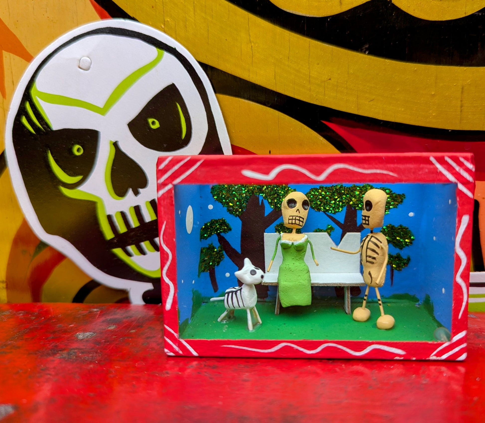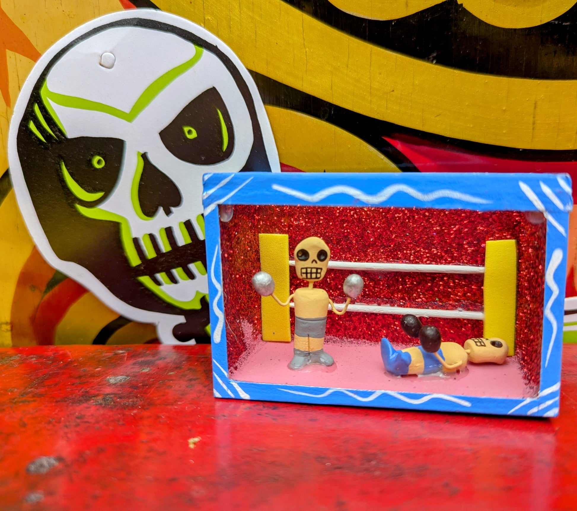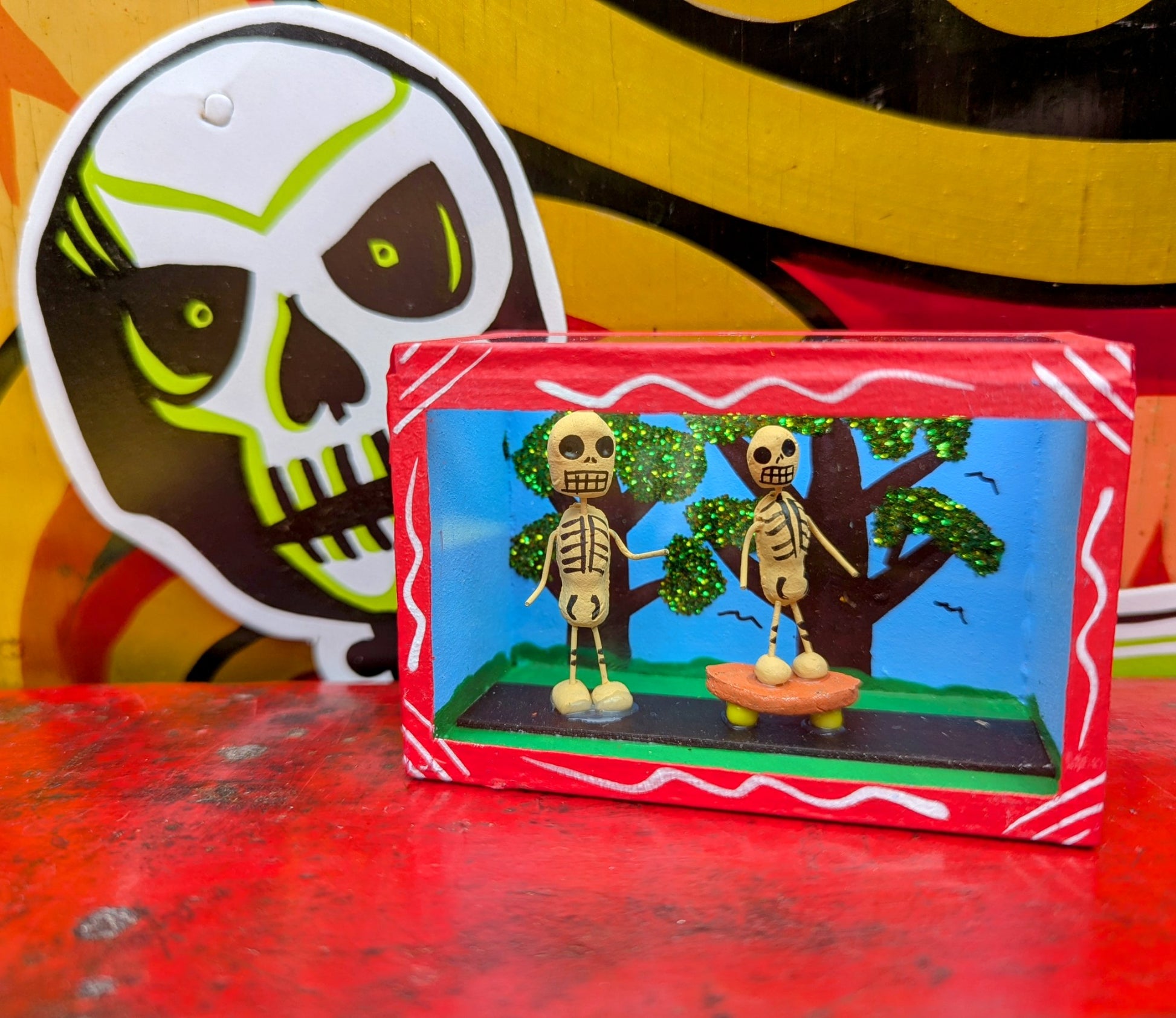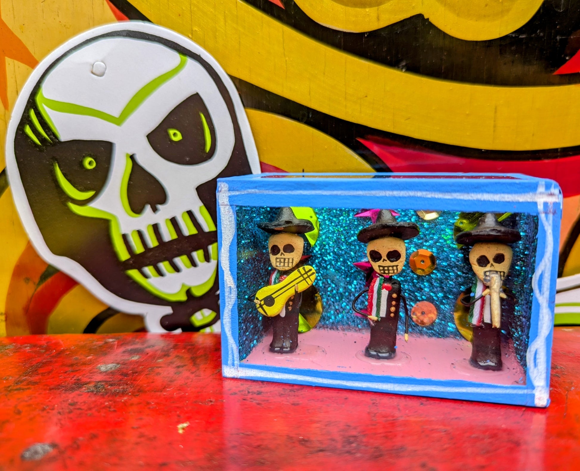 Originating in the Roman Catholic tradition of creating portable shrines known as Retablos, these Dia de los muertos Nichos depict scenes of vocations with handmade skeleton figures.