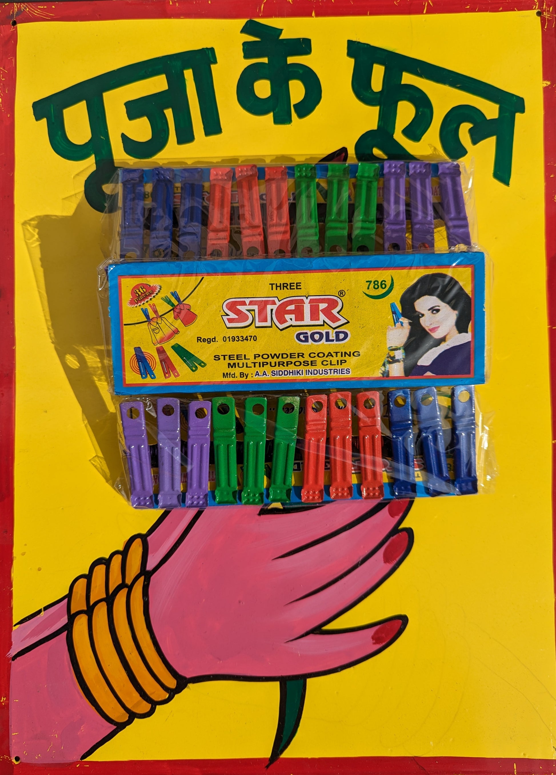 Brightly powder coated iron steel pegs, in the best 'super gold' classic kitsch packaging. These are great for clipping all of your open packets shut in the cupboard, clipping up posters, washing on the line and a whole manner of other uses! 12 pieces per pack.
