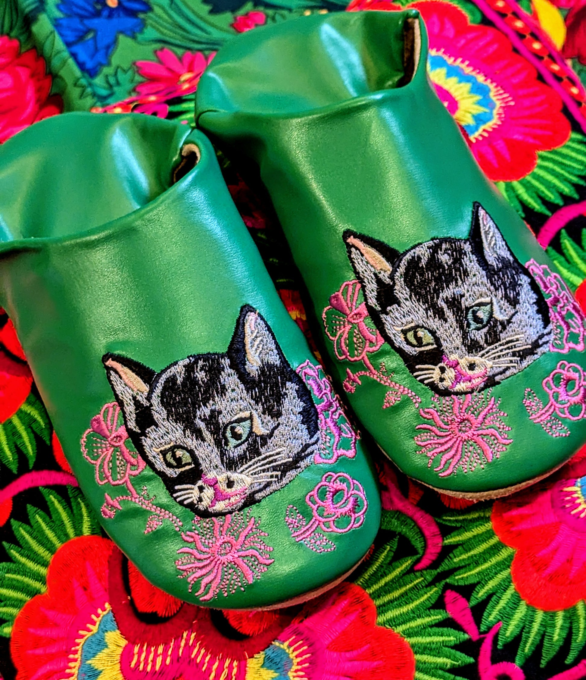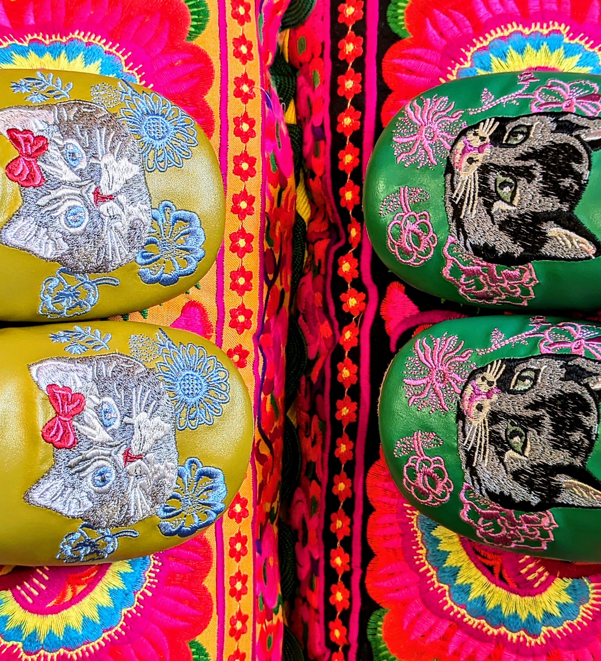 Beautifully embroidered sweet cats on these Japanese slippers,