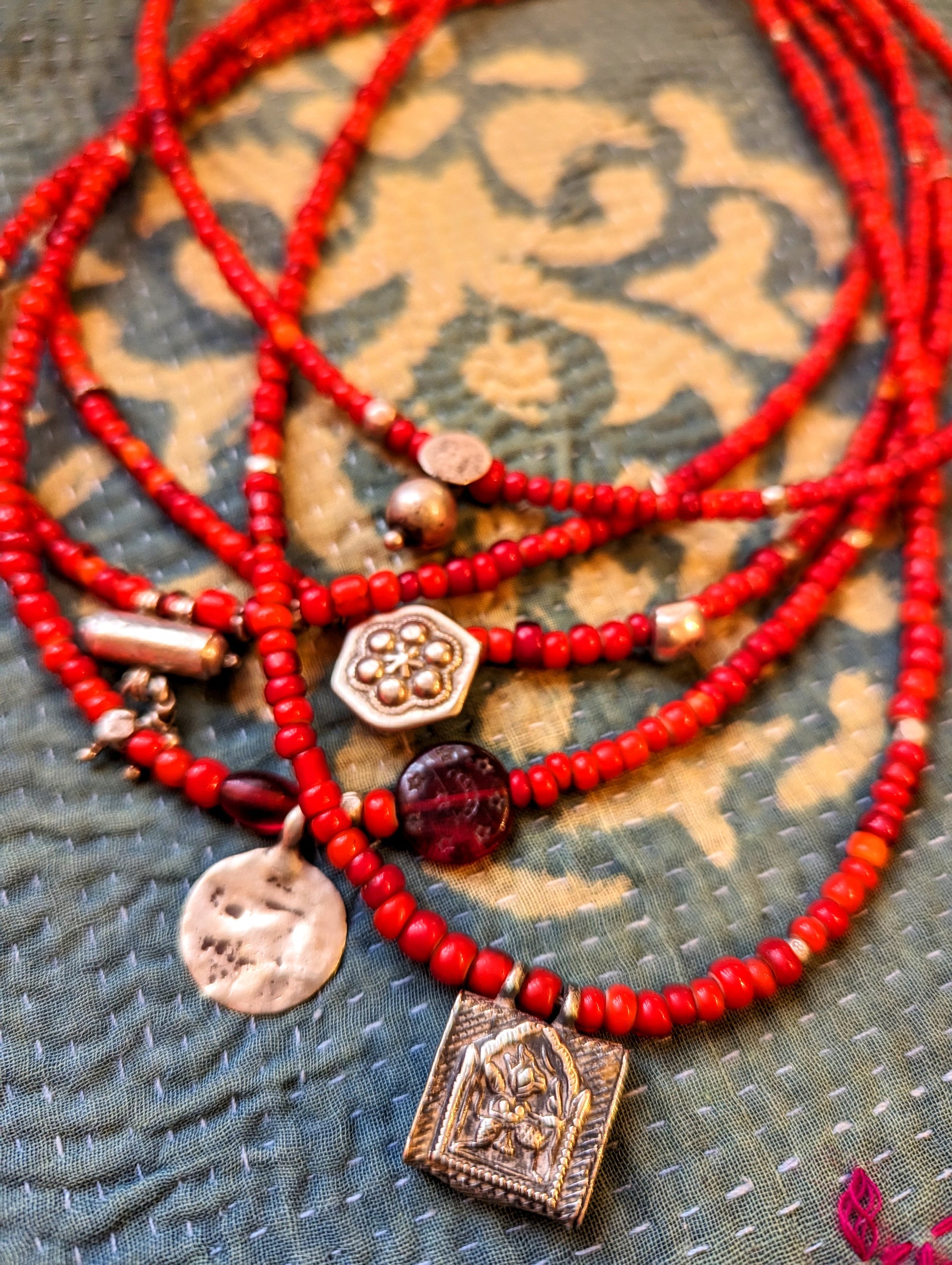 A collection of necklaces made with antique glass beads, antique silver pendants, all unique and different. The red beads are Venetian 19th C white hearts,which were called that as they are a layer of red glass over white.