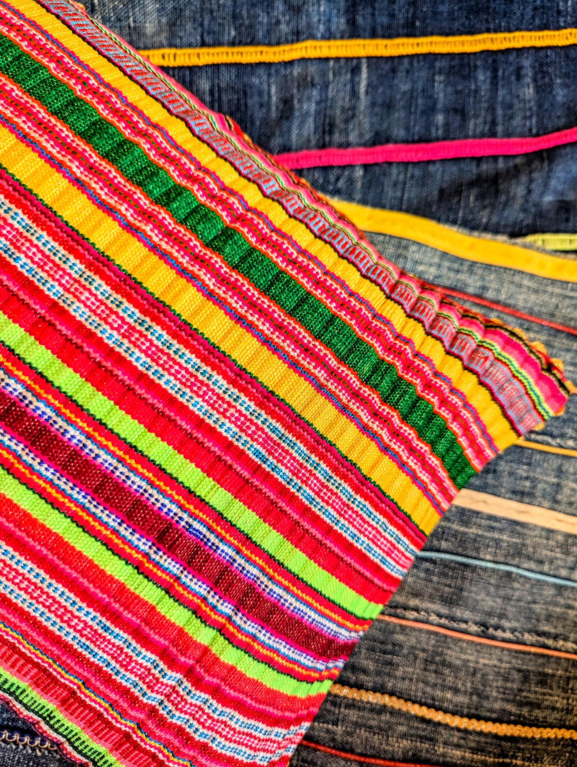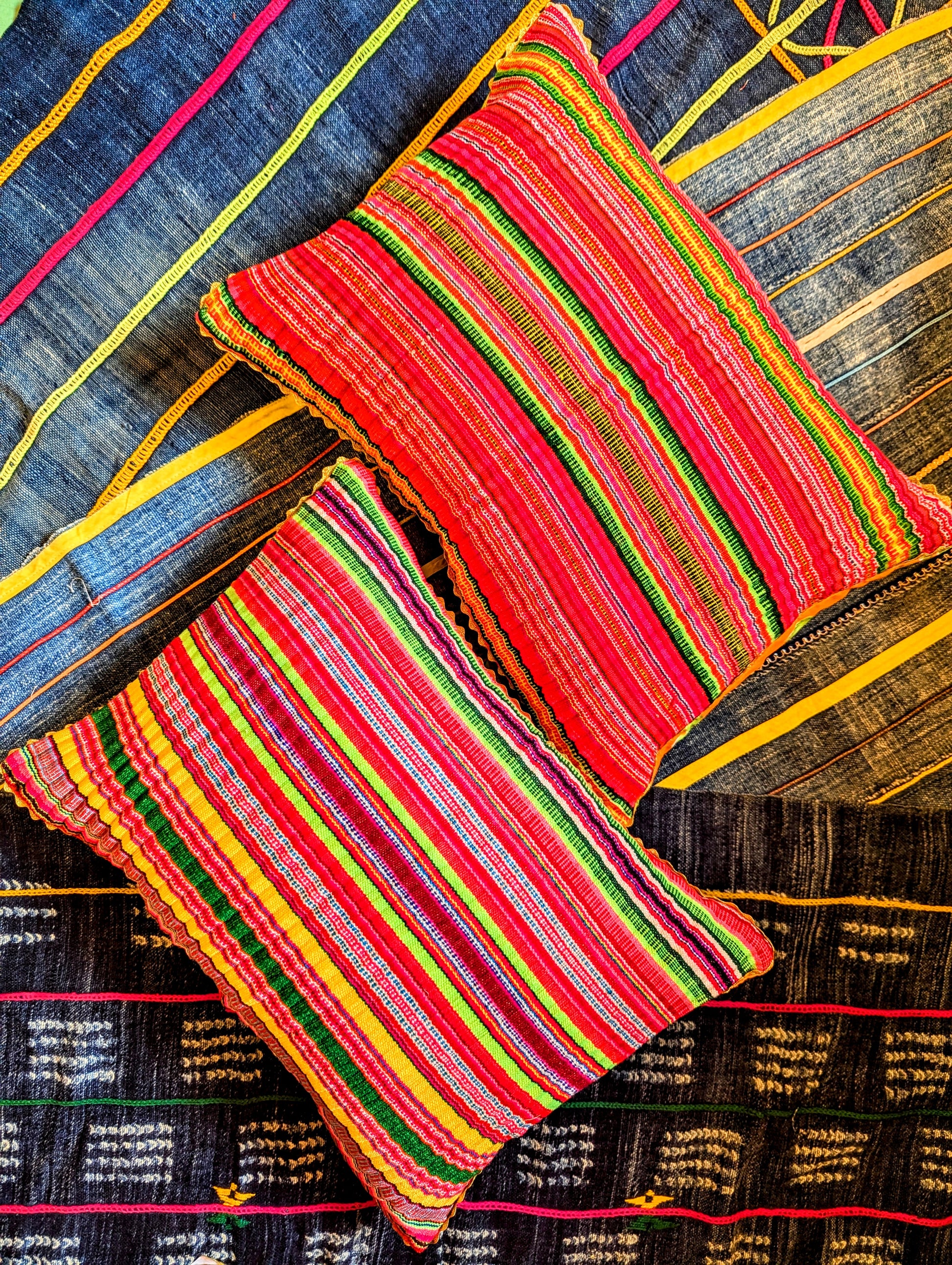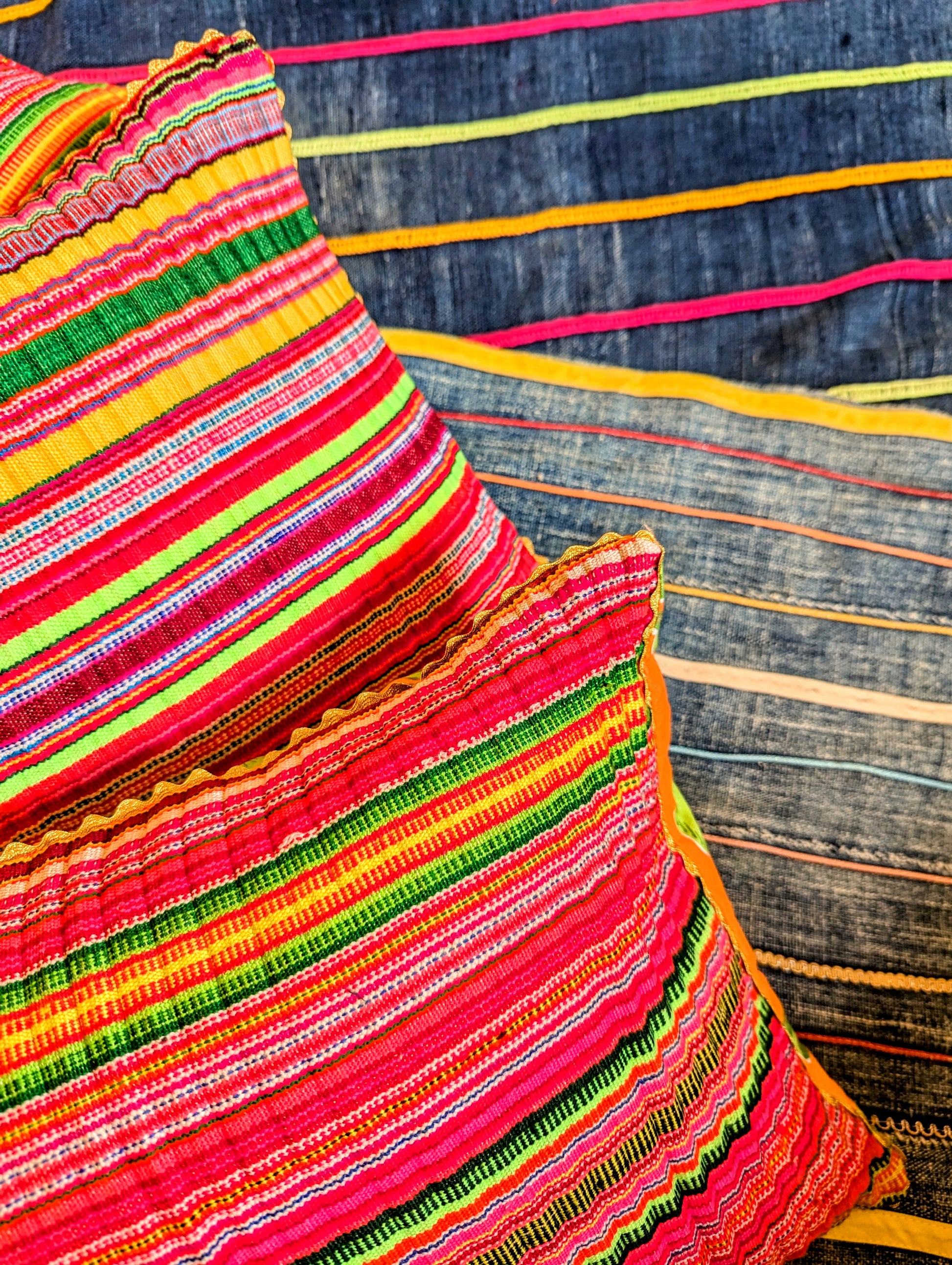 A glorious rainbow of stunning old Hmong tactile textile fabric, originally from pleated Hmong skirts, hence the pleated finish. Made especially for us in Thailand, these have been backed in varied floral kitsch fabric, and edged in gold ric rac, for a bit of EXTRA😁🌈