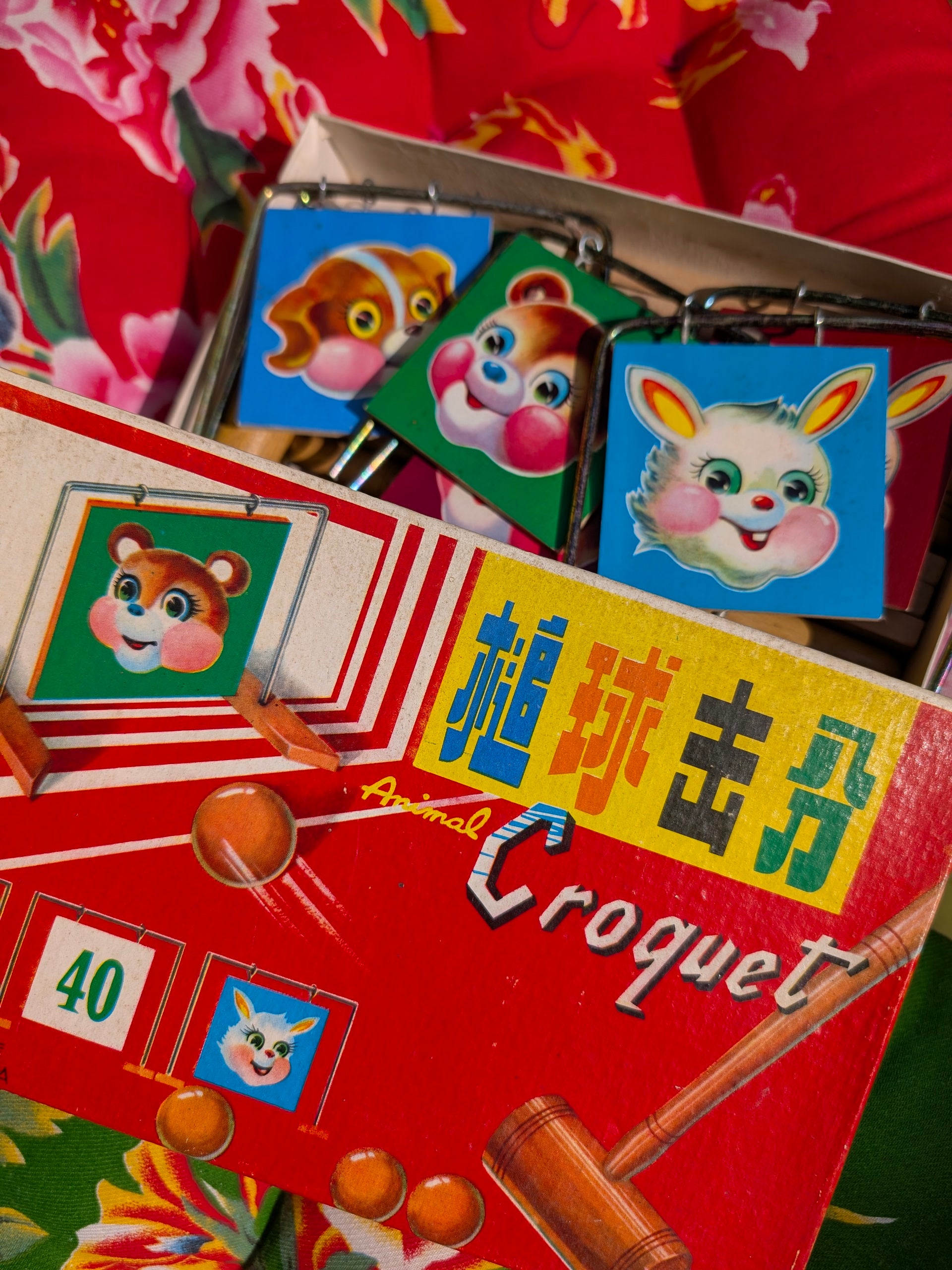 Just the cutest vintage dead stock Chinese made Croquet set from the 1960s, great illustrations too!! Play inside or outside with the handy stands to set those cutie animals in.