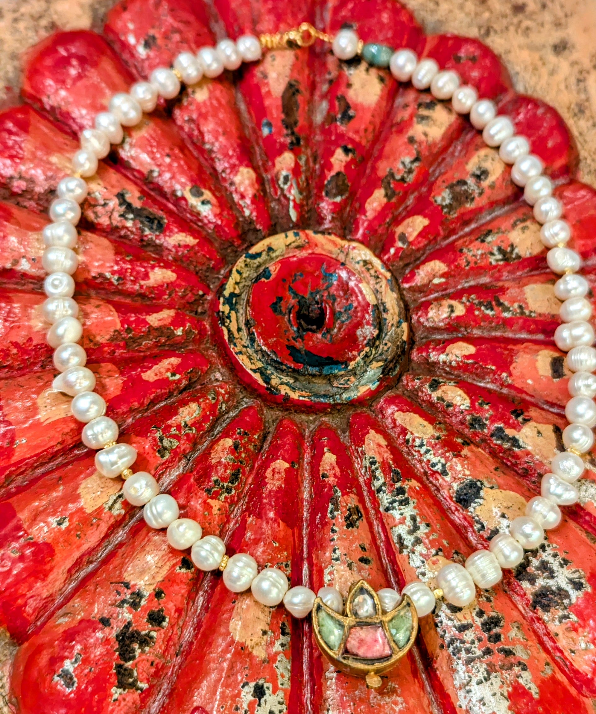 Threaded on tiger tail for strength, glass and pearl beads and gold plate with glass polki pendant.