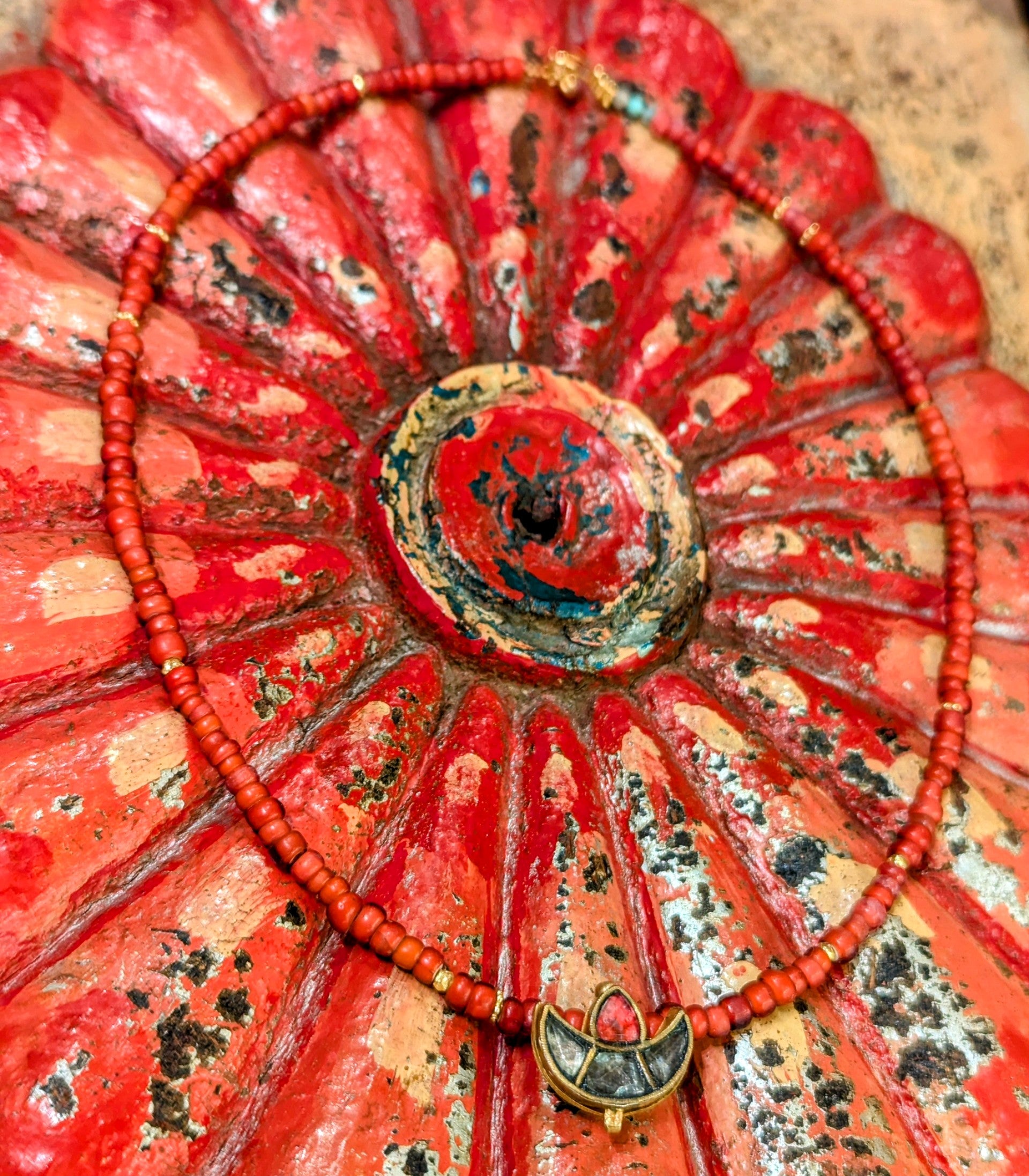 These pendants are the costume version of such riches! We found these gorgeous vintage pieces in Jodhpur while scouring for treasure. Threaded with gold plated spacers, fastings in pearl or vintage glass beads.