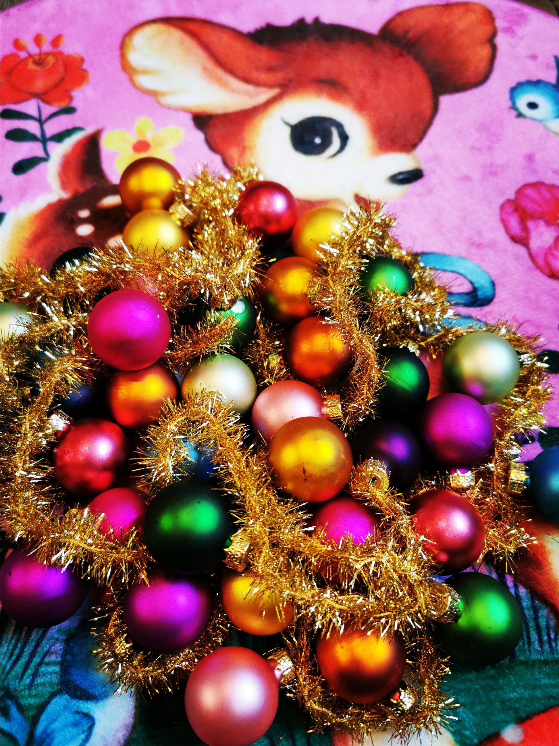 A glorious garland of rainbow coloured glass baubles on super shiny soft tinsel for a beautiful vintage Xmas.